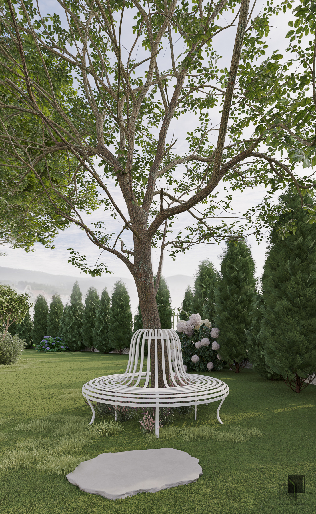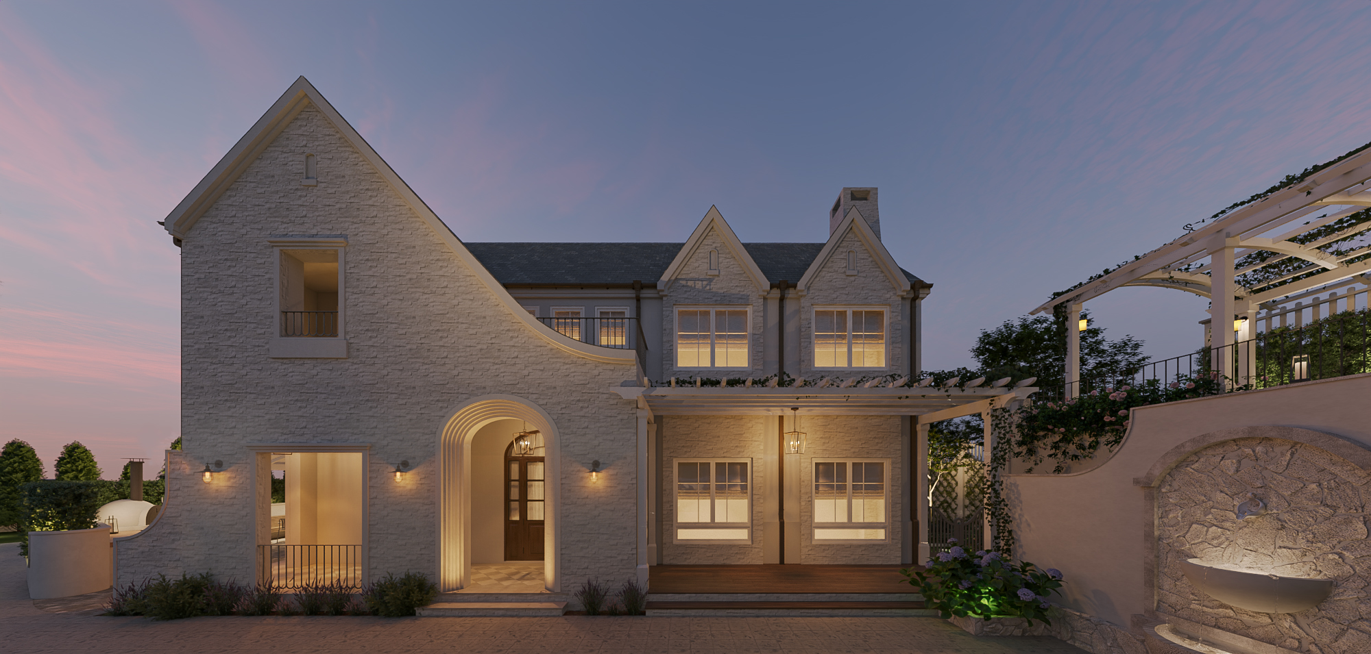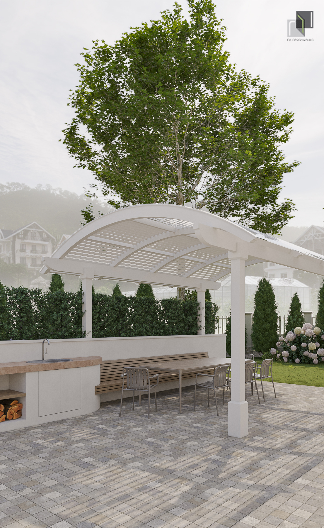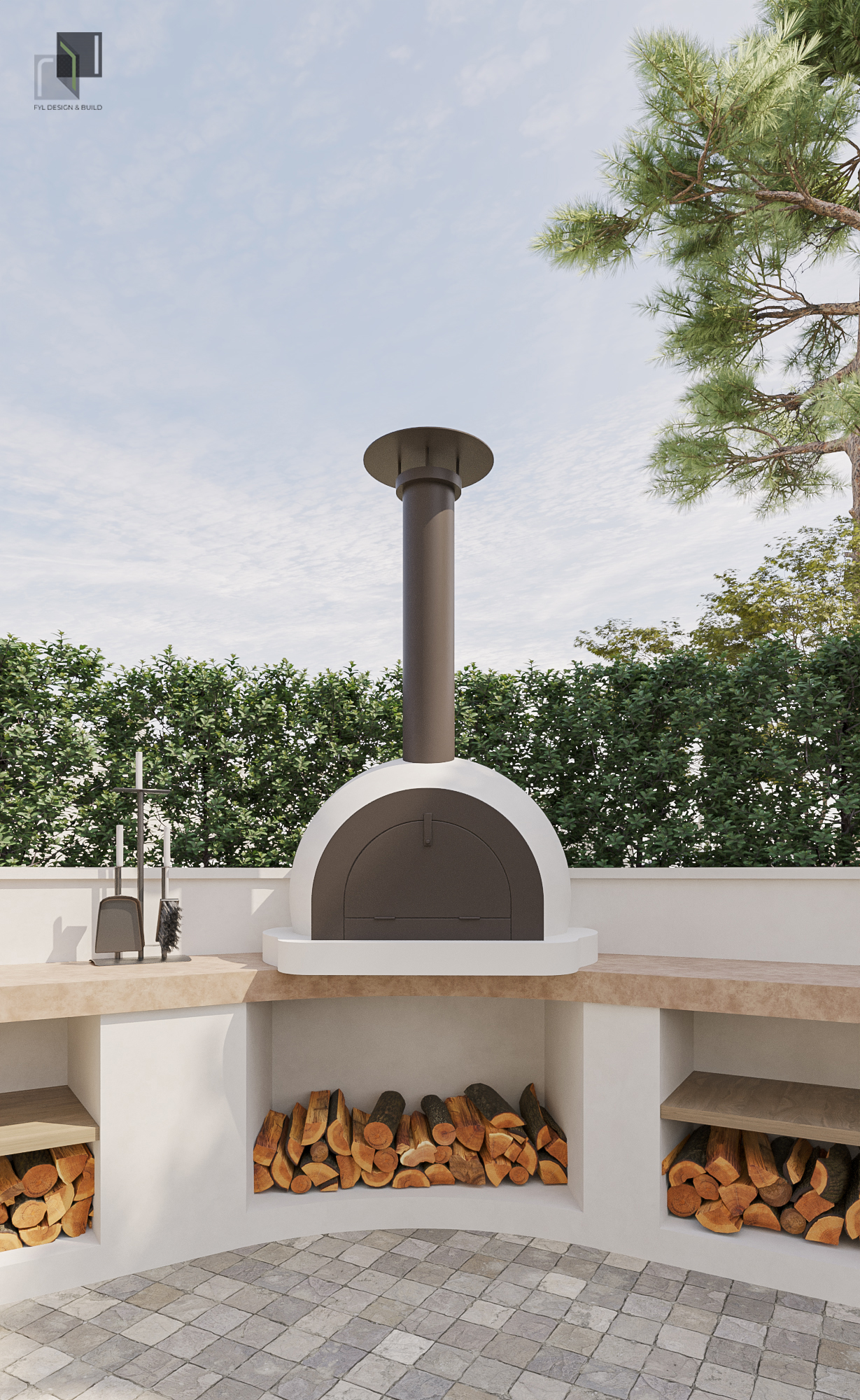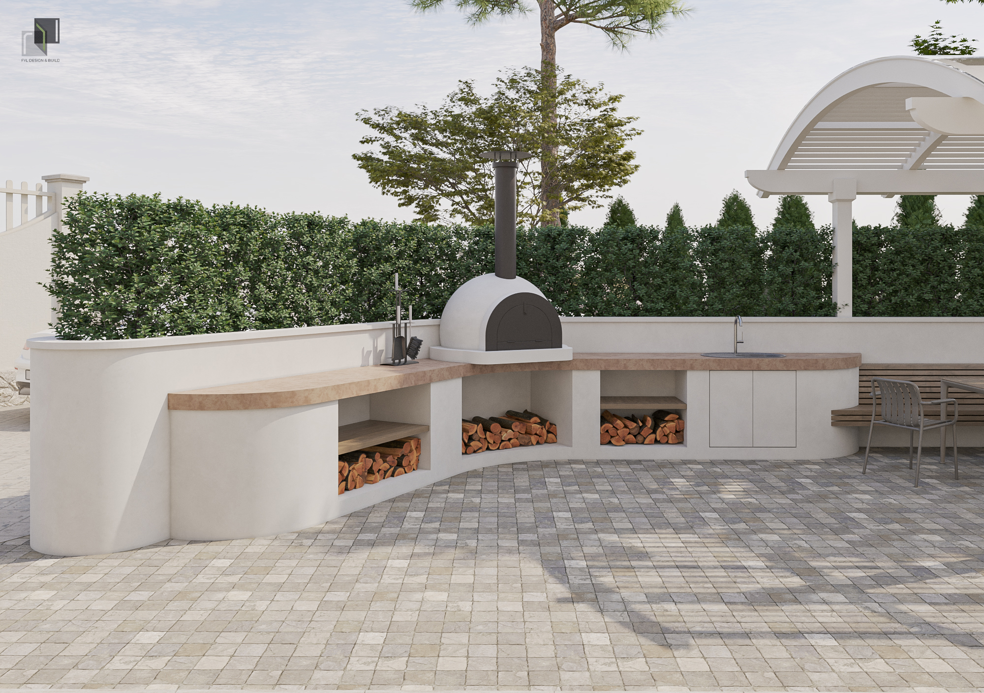 A space sometimes only needs one detail to create a feeling of gathering. Seating areas under the trees, an outdoor chimney, and a fireplace—symbols of warmth and togetherness—are the heart of the home. The curved kitchen island follows the architecture of the house, featuring neatly stacked firewood that creates a cozy country kitchen feel. Outdoor parties happen amidst the scent of leaves, and stories are told under the trees, while the architecture gently steps back to let nature lead the emotion.