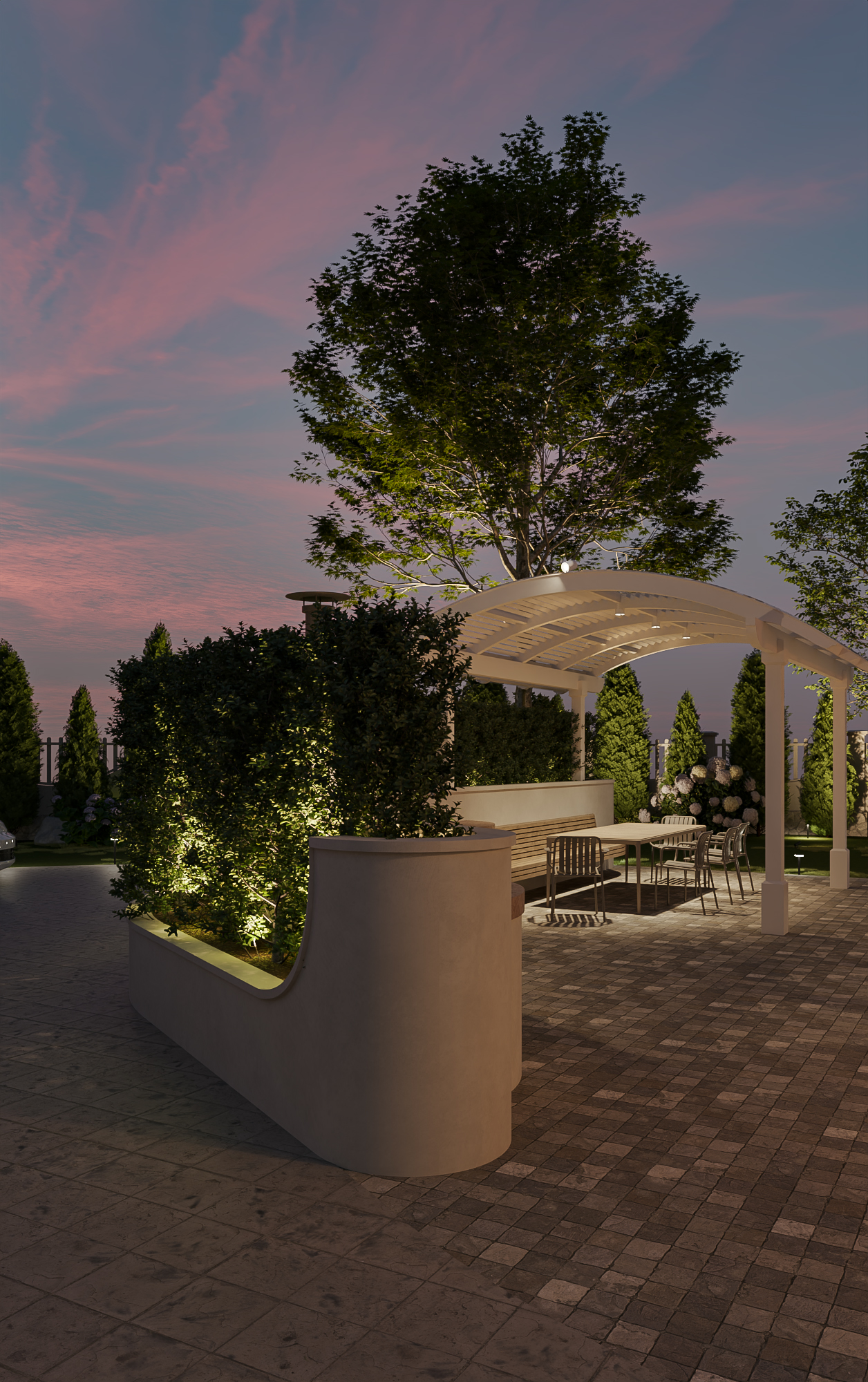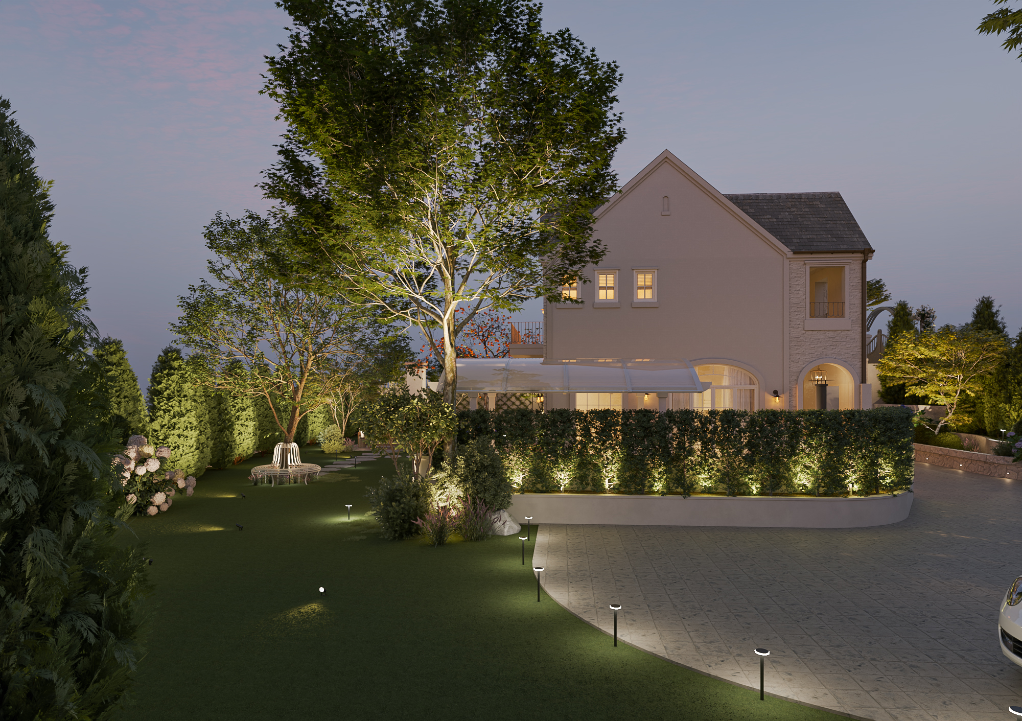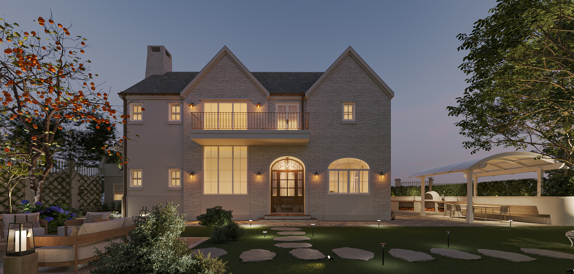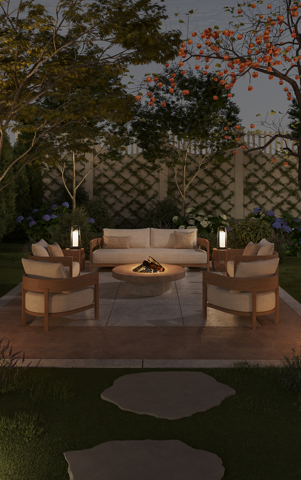 A space sometimes only needs one detail to create a feeling of gathering. Seating areas under the trees, an outdoor chimney, and a fireplace—symbols of warmth and togetherness—are the heart of the home. The curved kitchen island follows the architecture of the house, featuring neatly stacked firewood that creates a cozy country kitchen feel. Outdoor parties happen amidst the scent of leaves, and stories are told under the trees, while the architecture gently steps back to let nature lead the emotion.