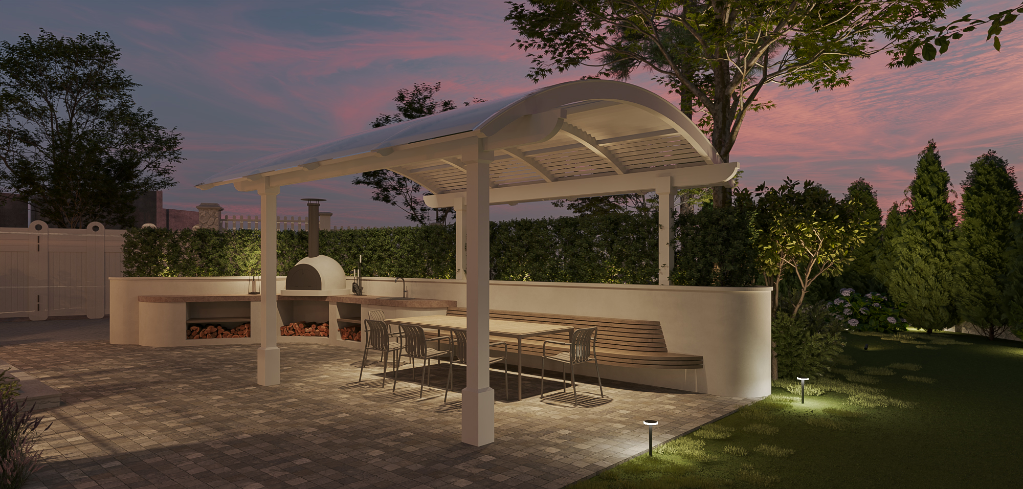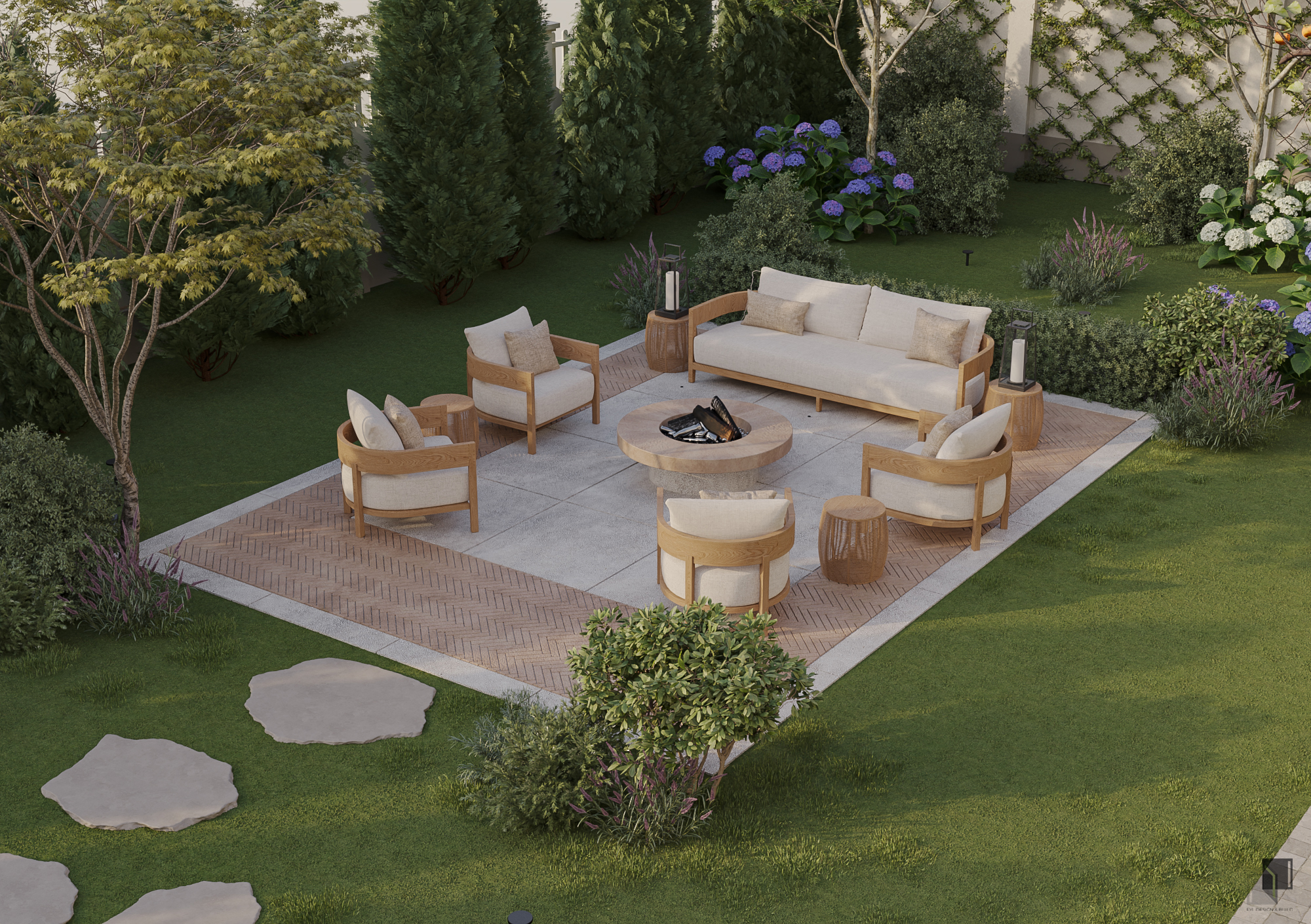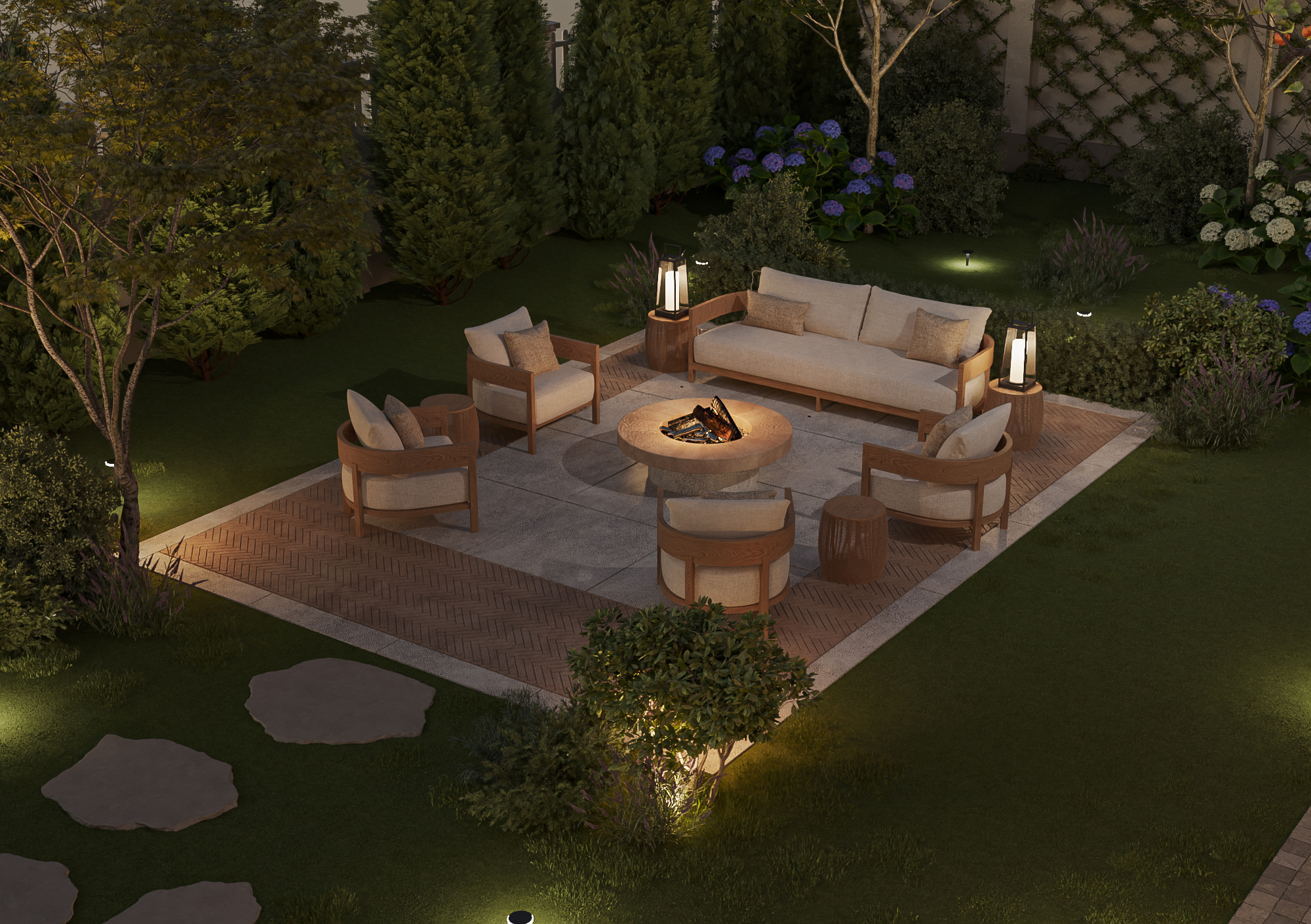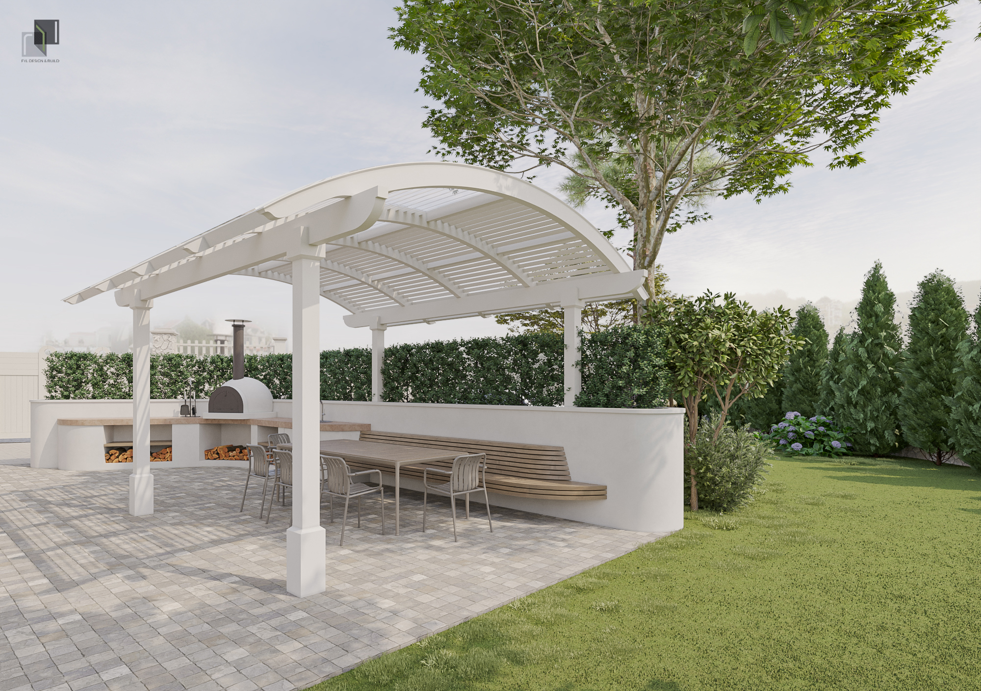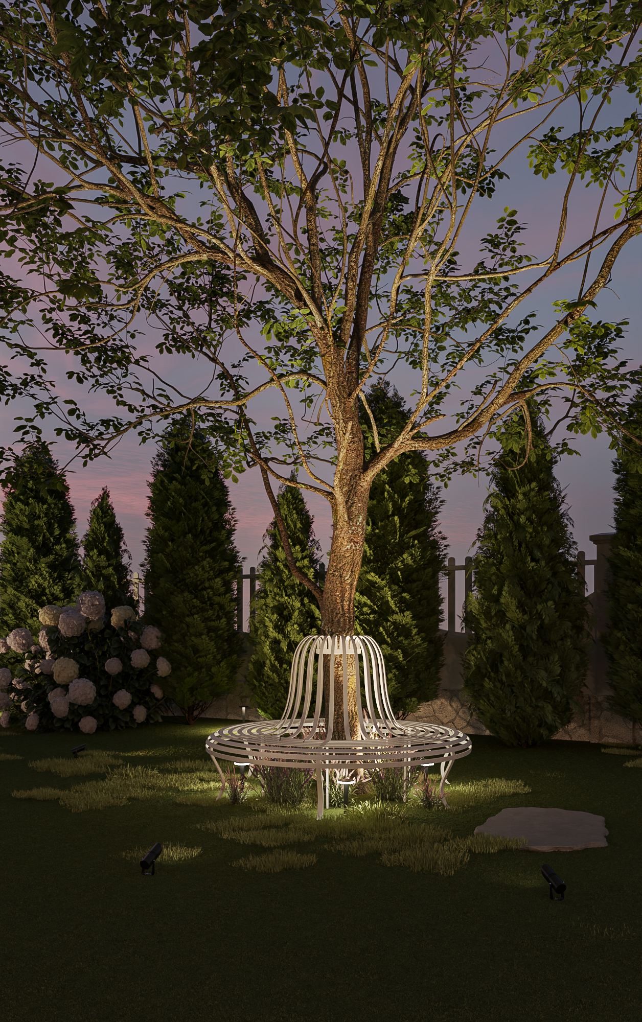 A space sometimes only needs one detail to create a feeling of gathering. Seating areas under the trees, an outdoor chimney, and a fireplace—symbols of warmth and togetherness—are the heart of the home. The curved kitchen island follows the architecture of the house, featuring neatly stacked firewood that creates a cozy country kitchen feel. Outdoor parties happen amidst the scent of leaves, and stories are told under the trees, while the architecture gently steps back to let nature lead the emotion.