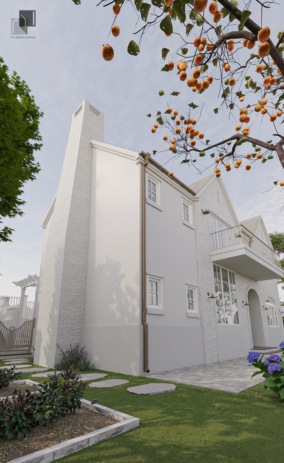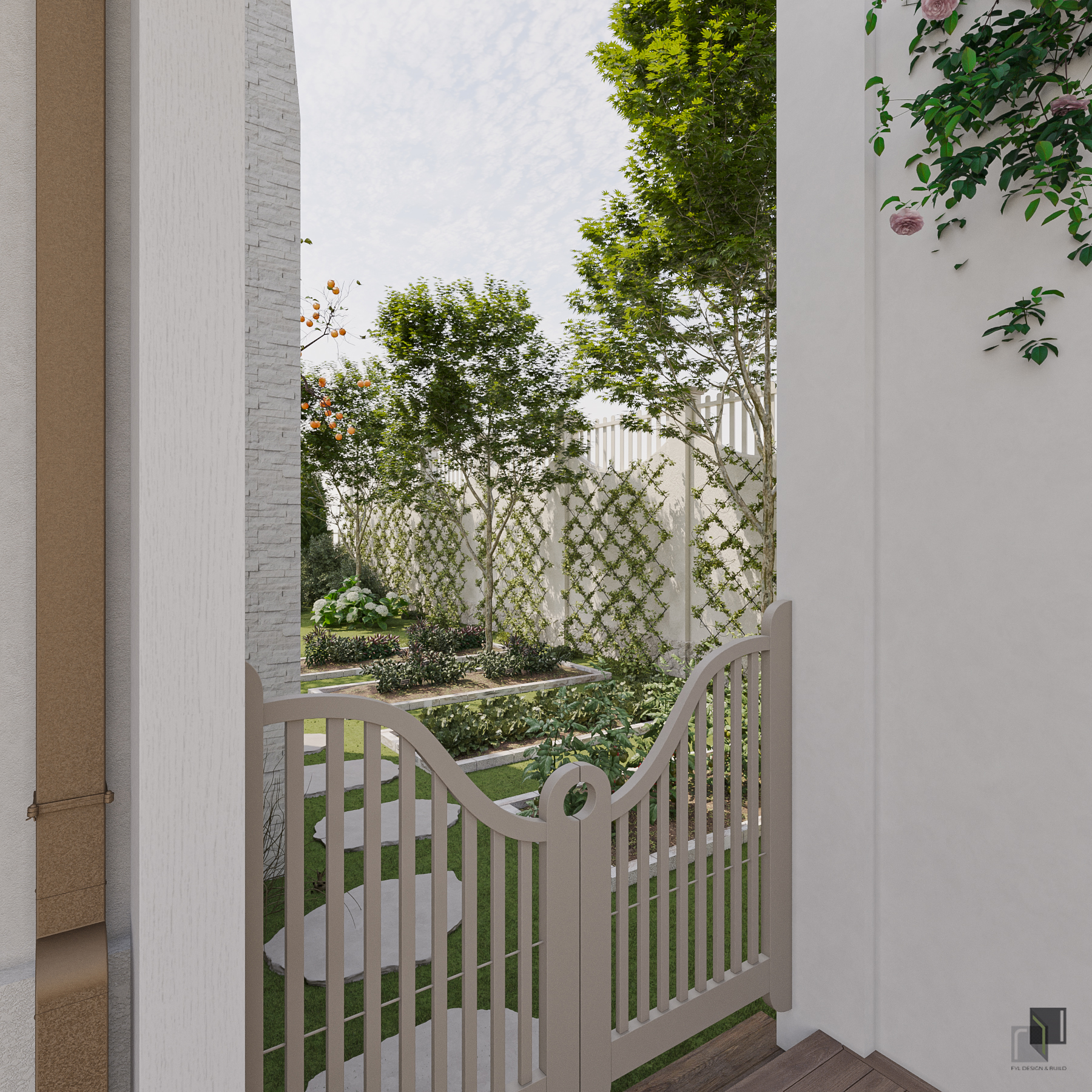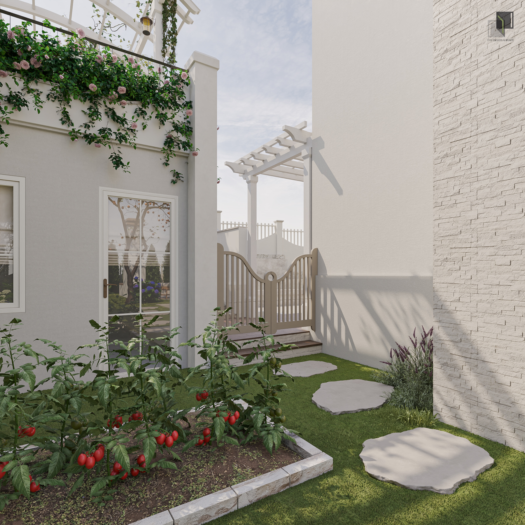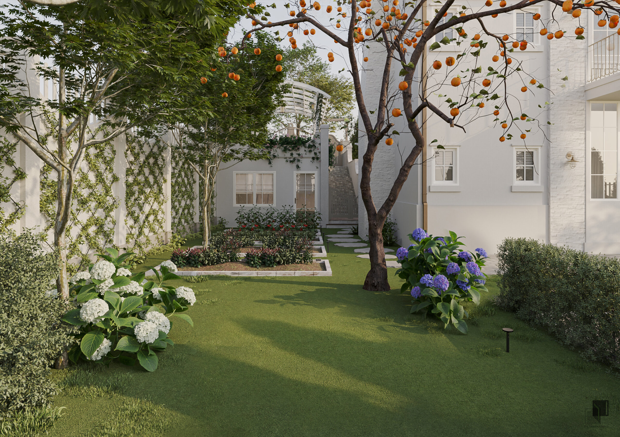 The backyard, where persimmon trees and a fresh vegetable garden create a simple yet vibrant scene. This is where the owners can plant, nurture, and enjoy the harvest, living a daily life that brings the peaceful breath of the countryside.