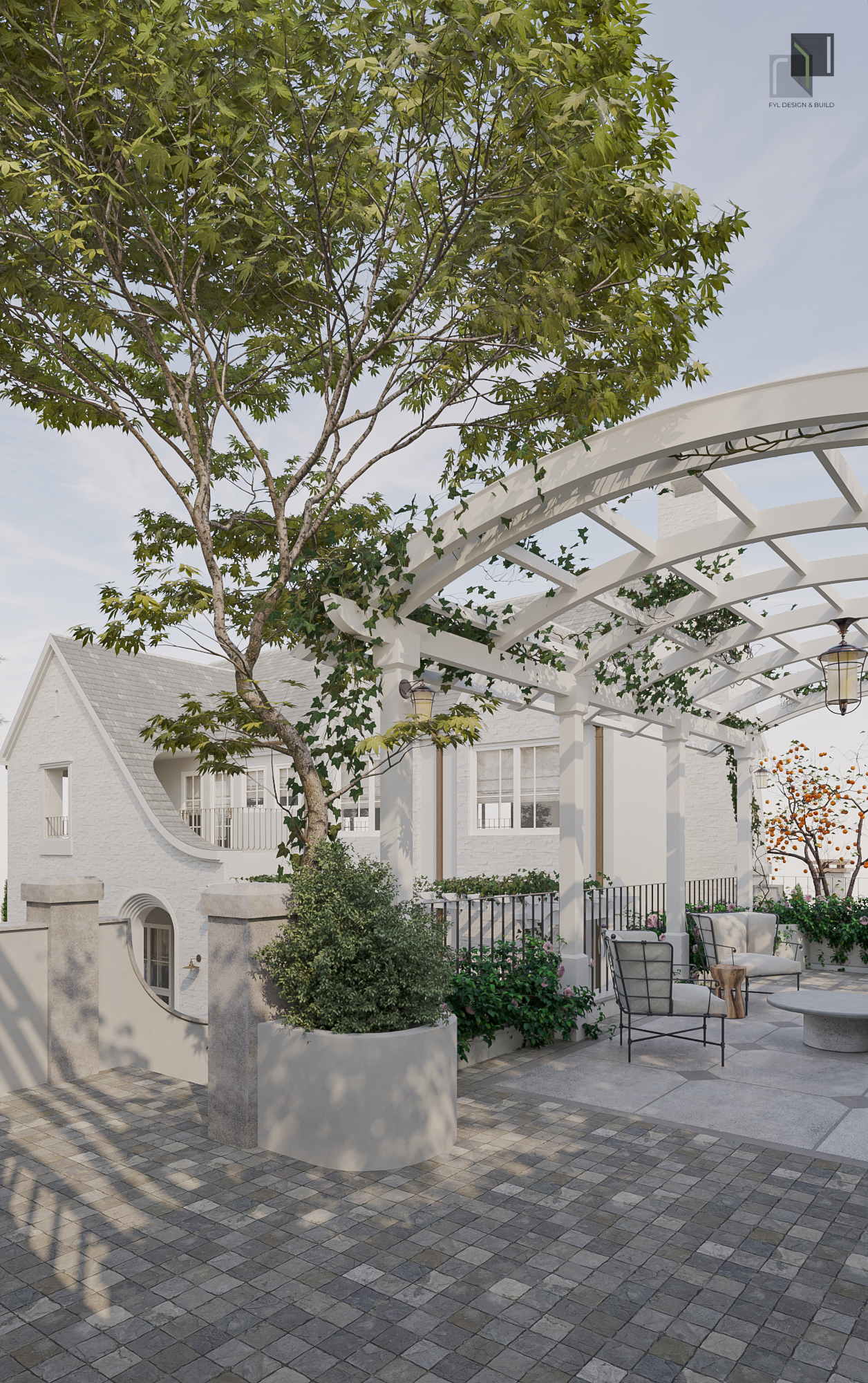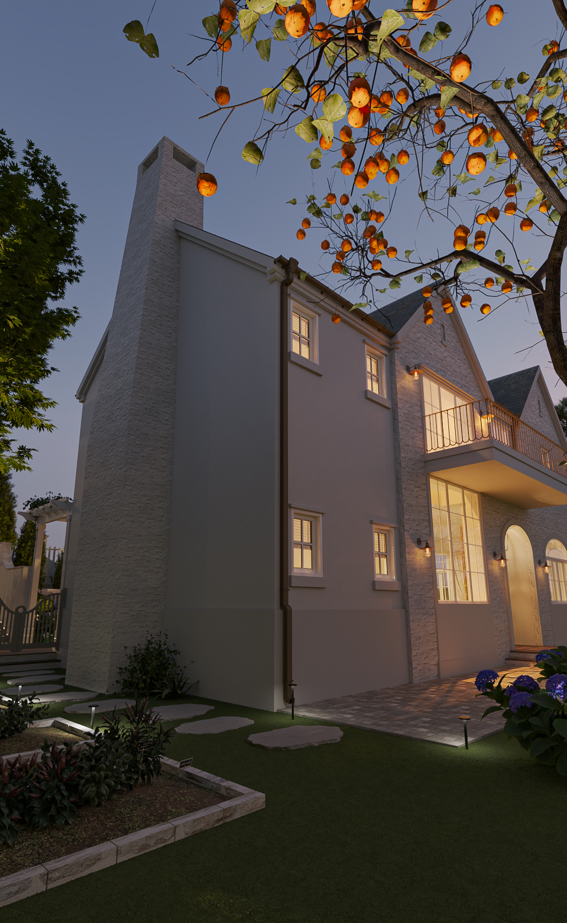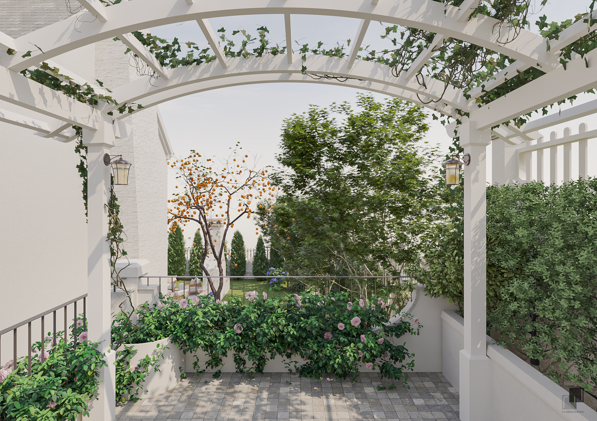The backyard, where persimmon trees and a fresh vegetable garden create a simple yet vibrant scene. This is where the owners can plant, nurture, and enjoy the harvest, living a daily life that brings the peaceful breath of the countryside.