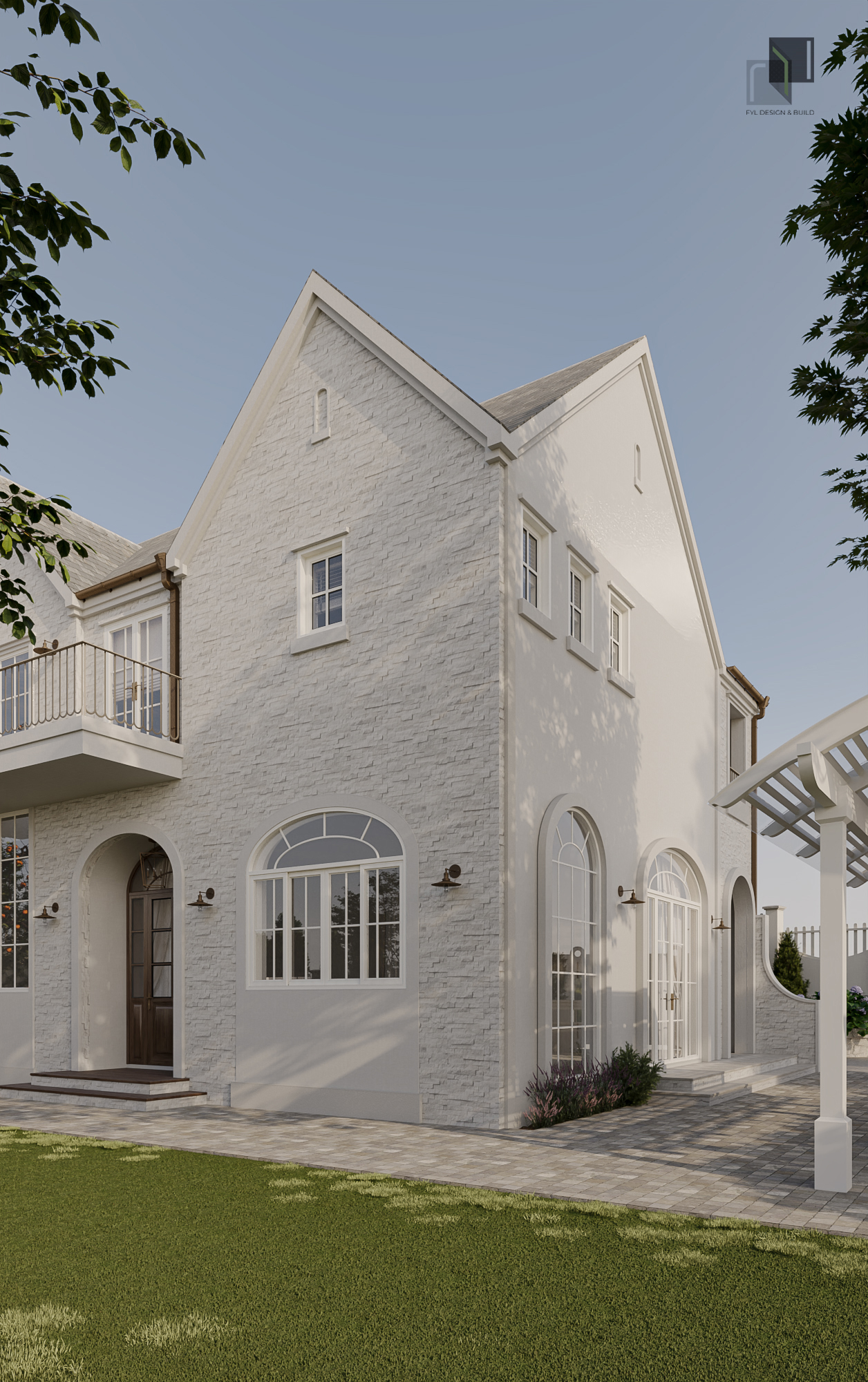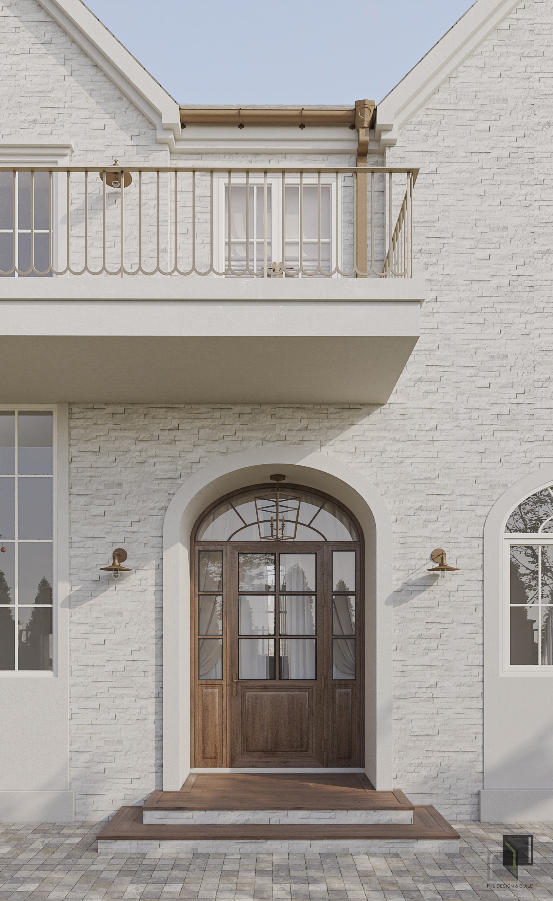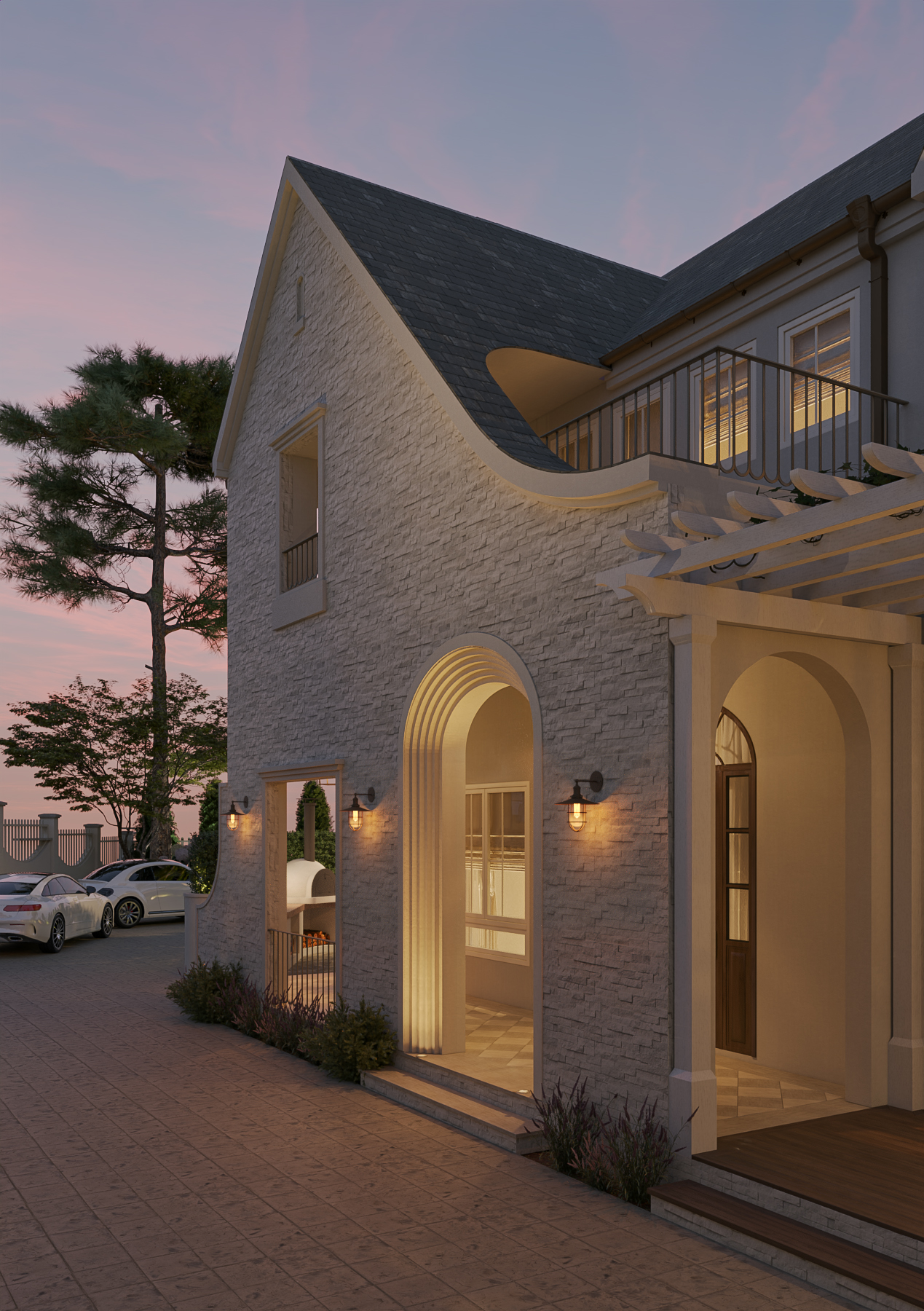 The first impression of the architecture comes from the strong sloped roof, featuring a large diagonal section that ends with a soft curve, making the building look stable but soaring above nature. The oval arch is also a key detail, appearing in the entrance pergola and the main door frames; this classic touch adds elegance and softens the sharp lines of the overall design.