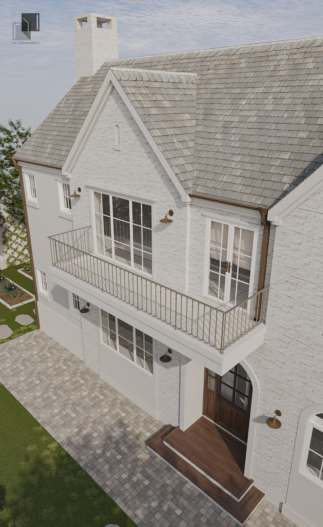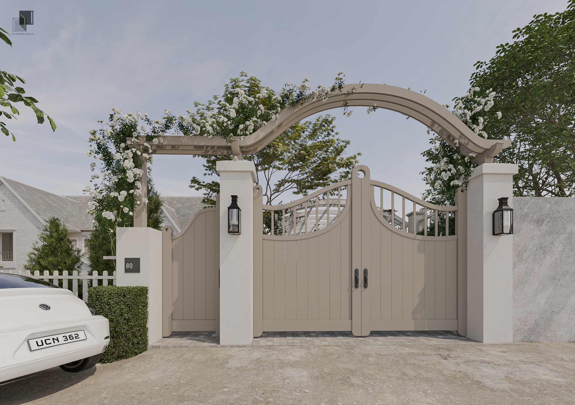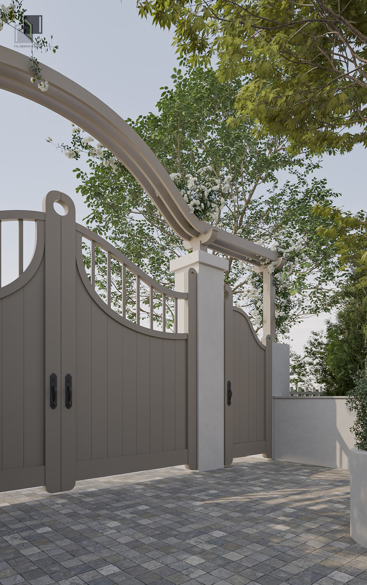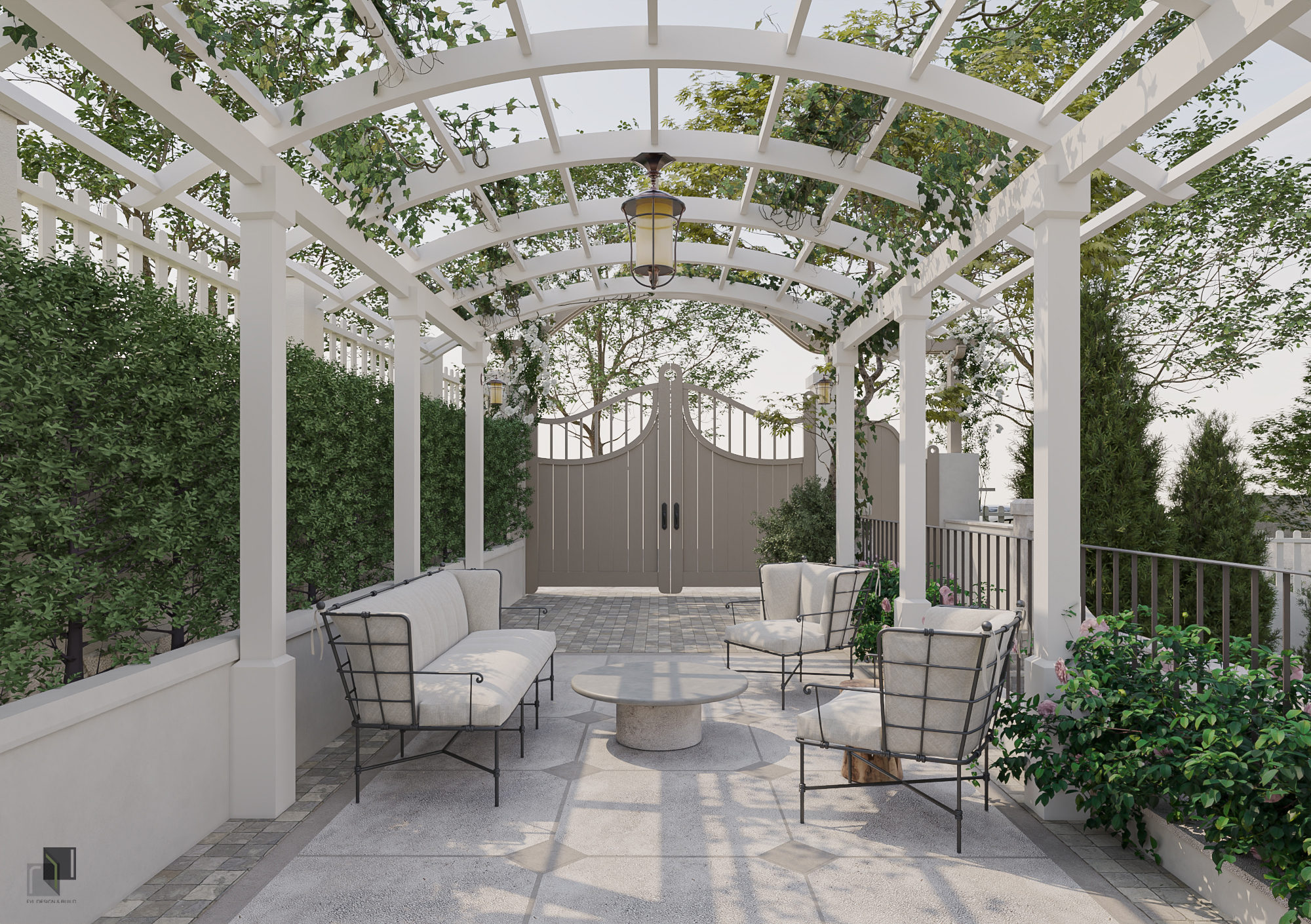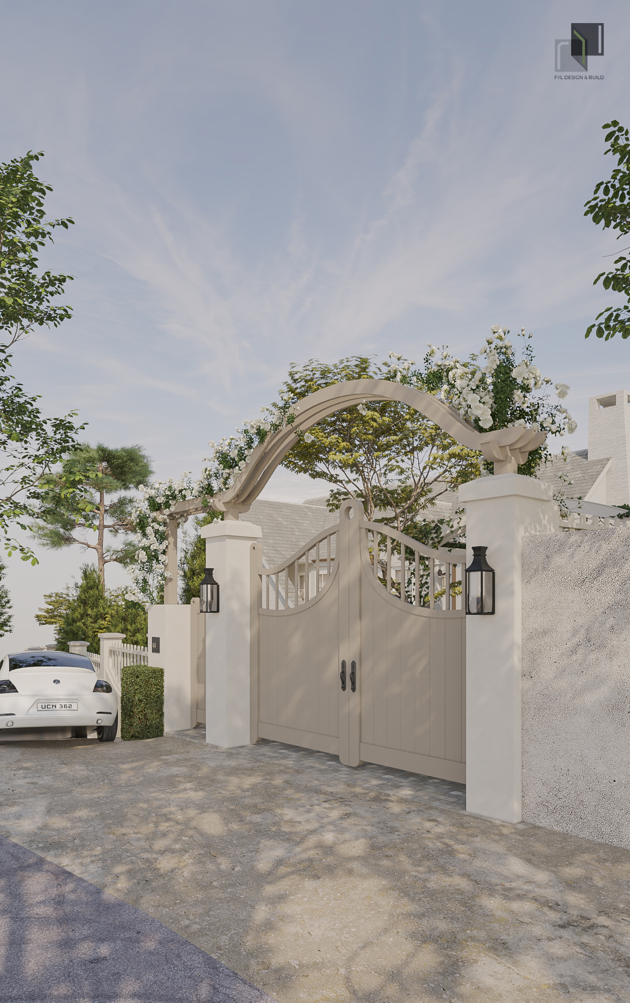 A wooden louver system creates a beautiful rhythm of light and shadow, while green vines wrap around like a natural silk layer, filtering the sunlight onto the front porch. Whenever the sun shines, the shadows of the leaves change shape, making the house feel as if it is breathing along with the garden.