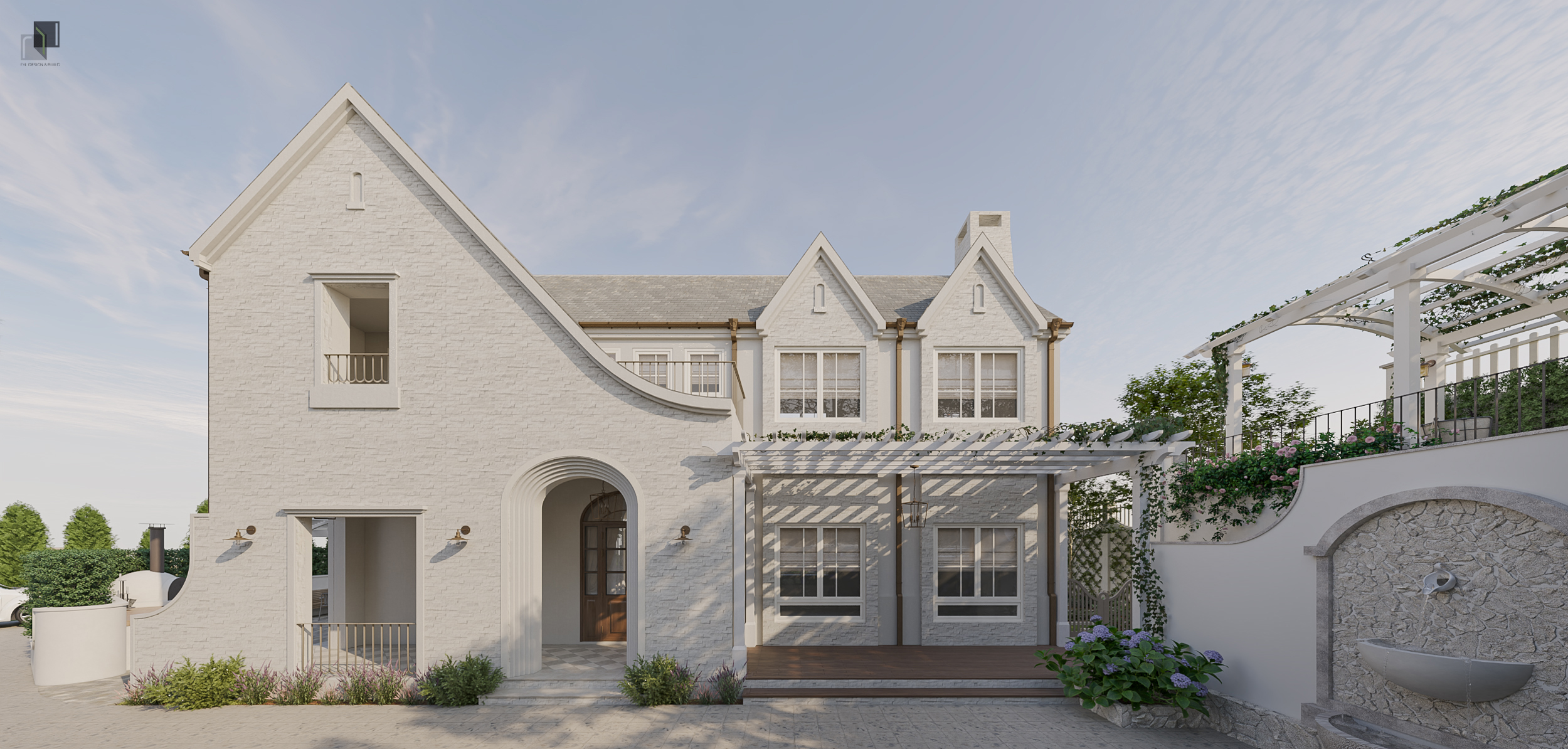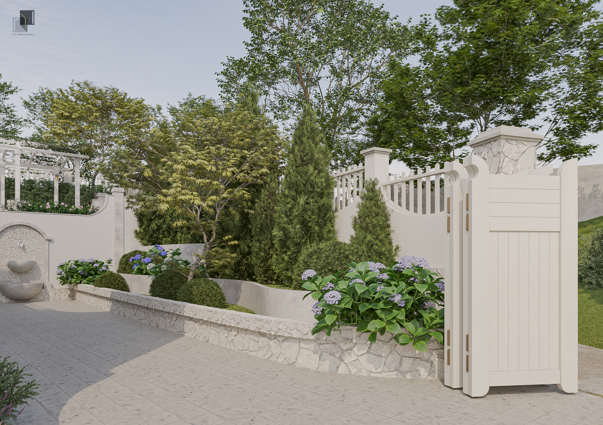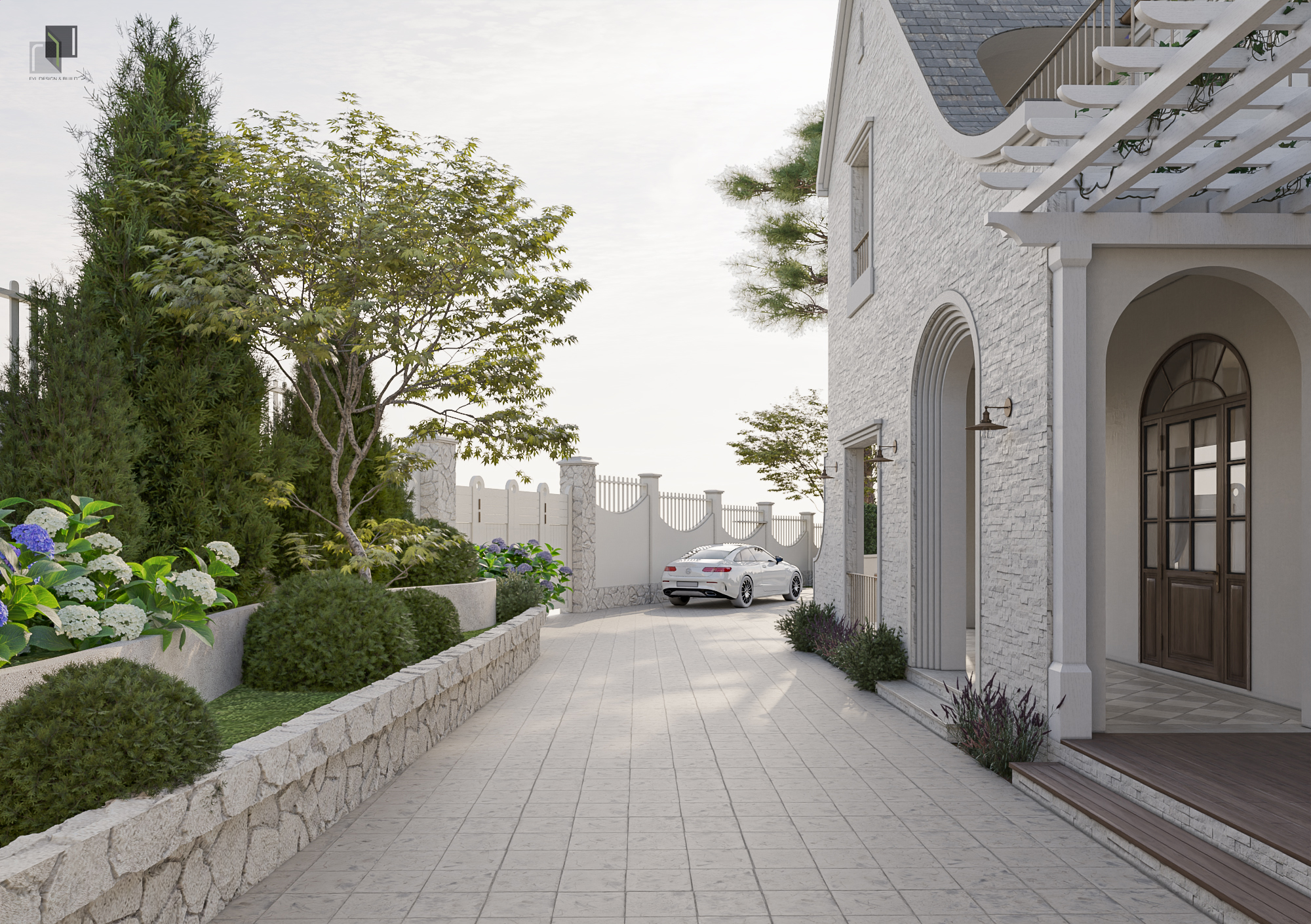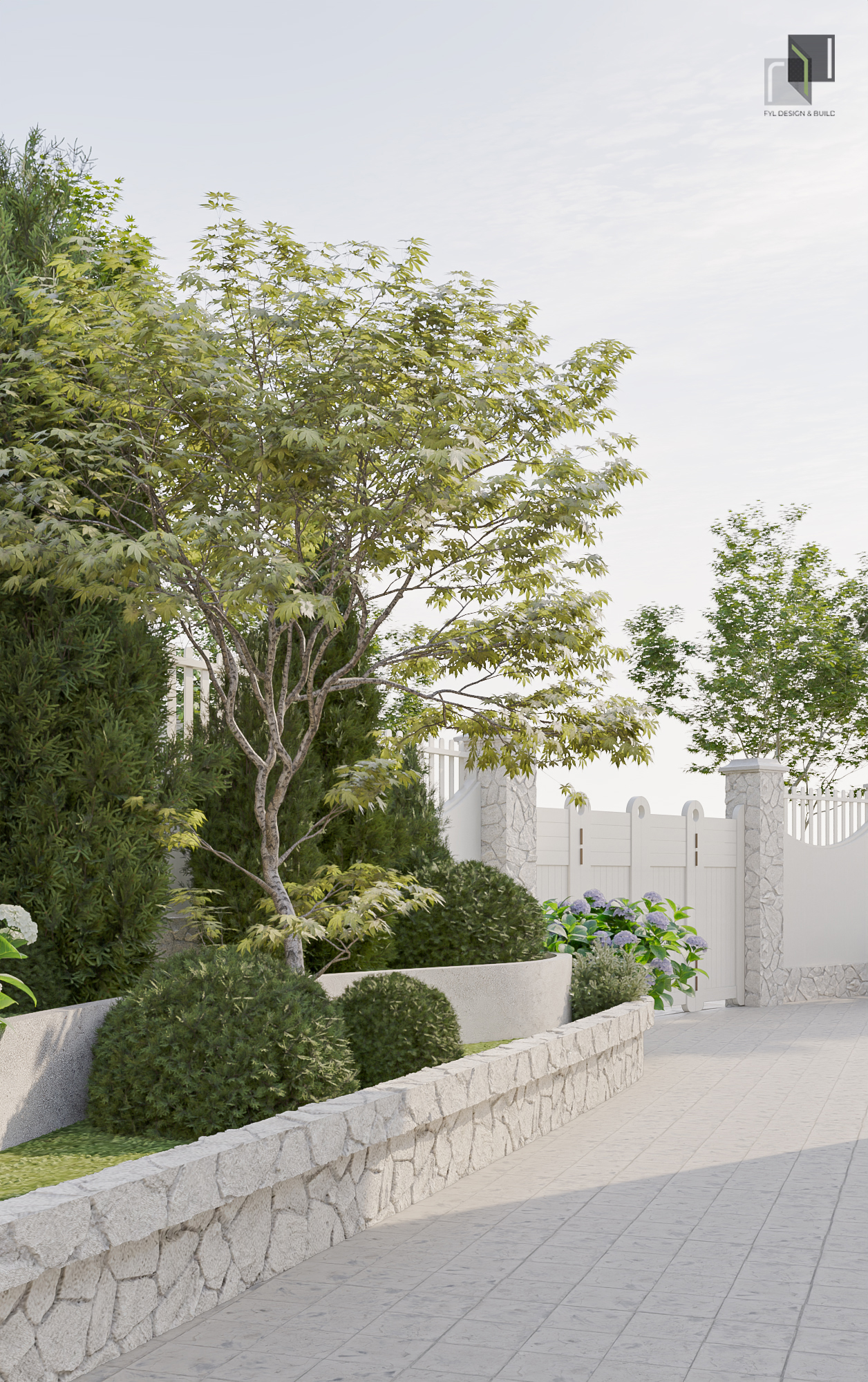The overall design uses an elegant creamy white palette, accented by grey stone and warm brown wood. Different areas are subtly divided by rough split-stone walls and garden paths.