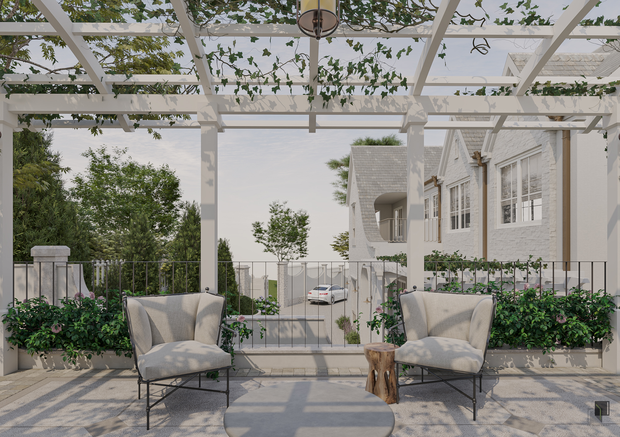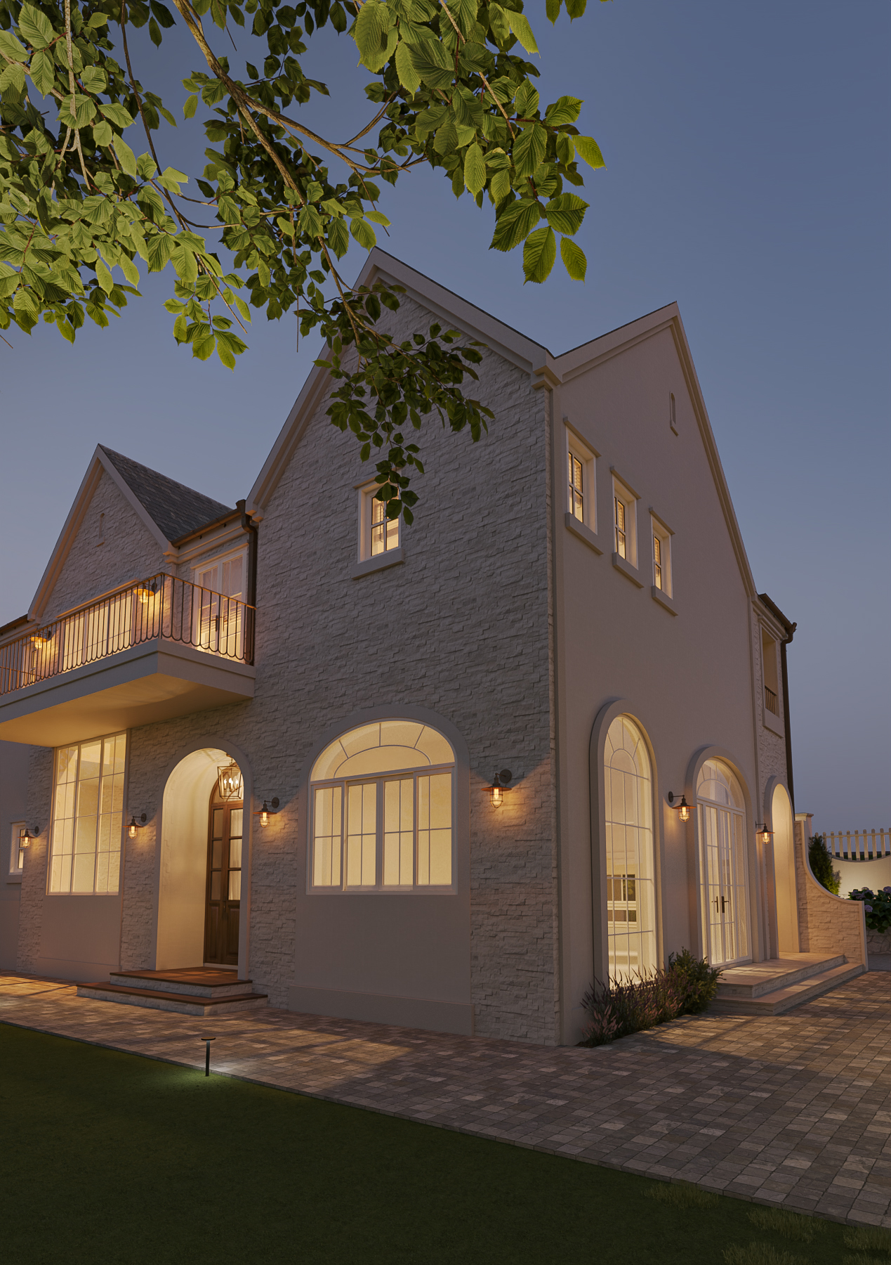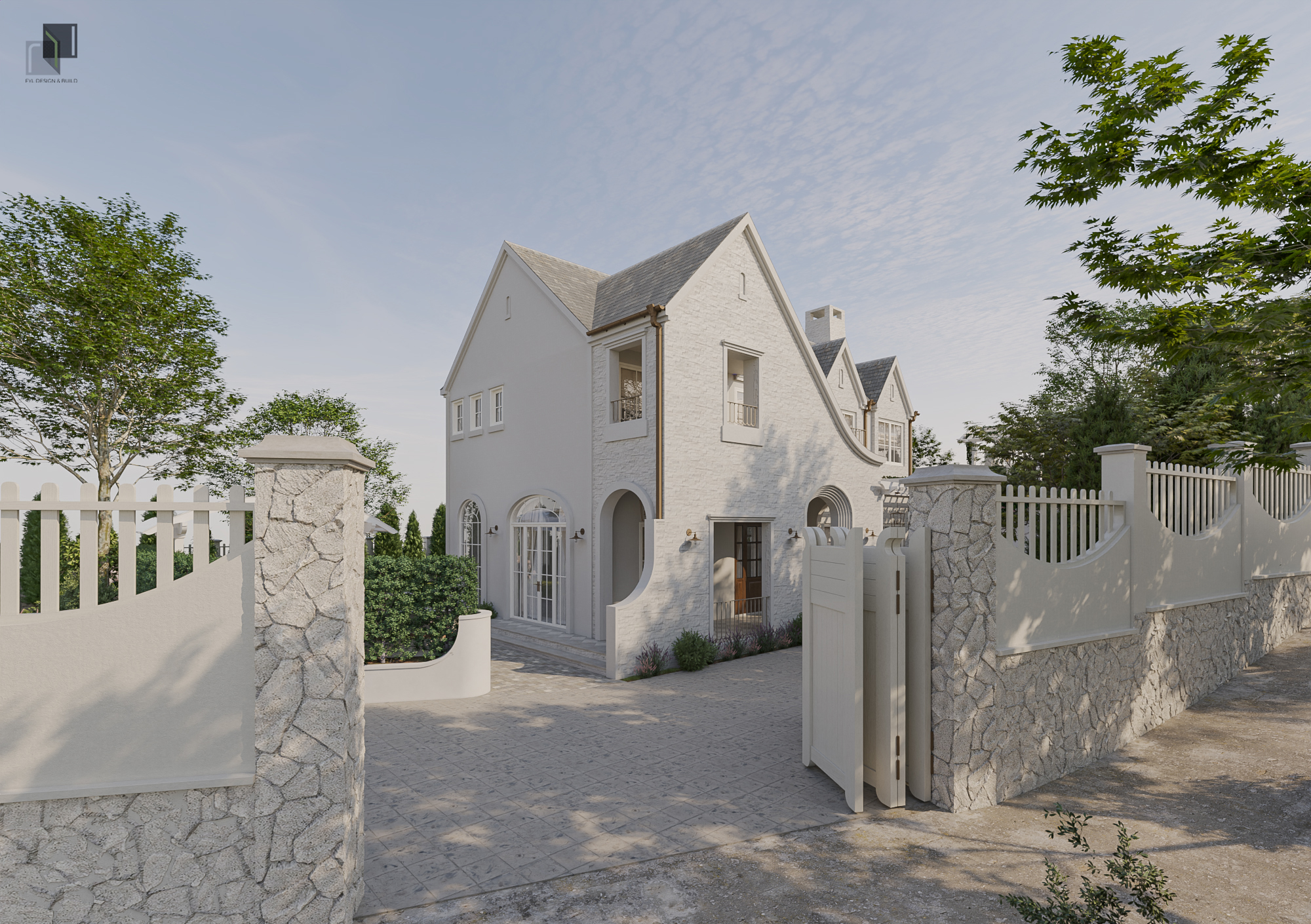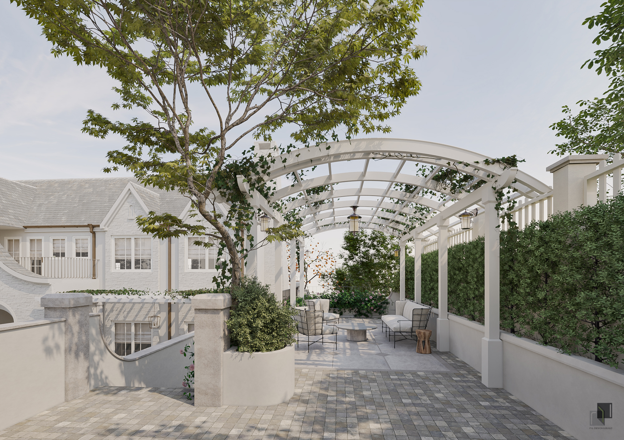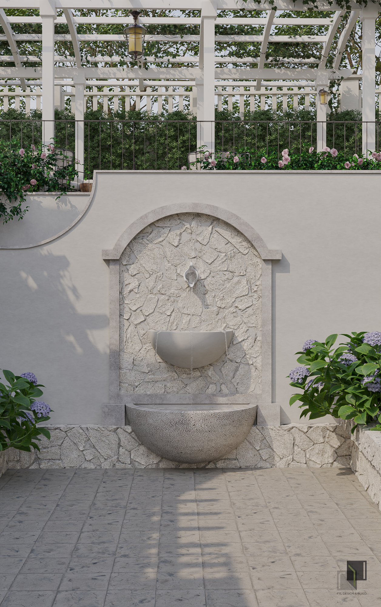 The overall design uses an elegant creamy white palette, accented by grey stone and warm brown wood. Different areas are subtly divided by rough split-stone walls and garden paths.