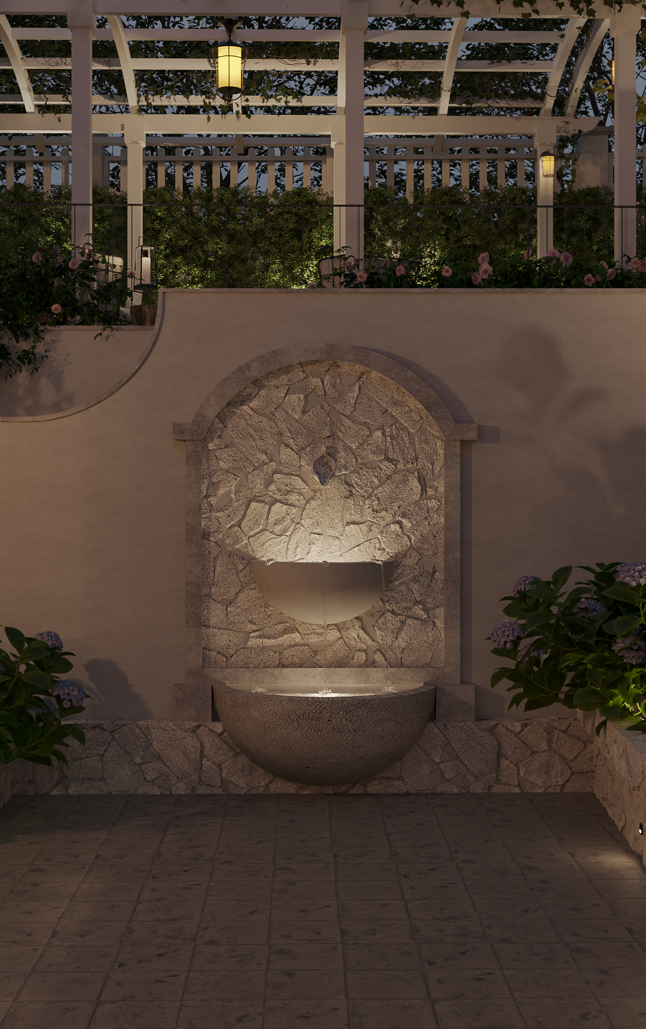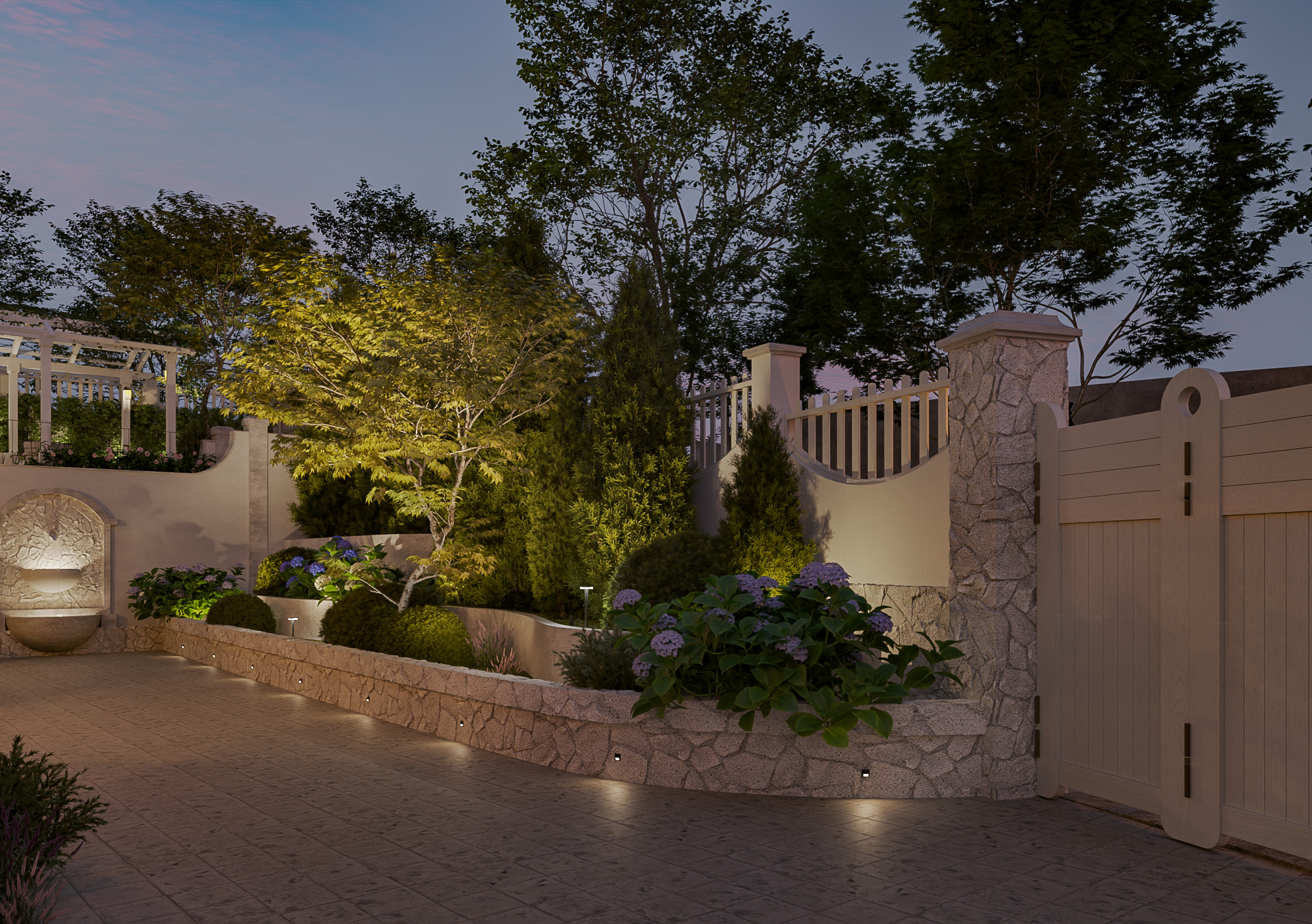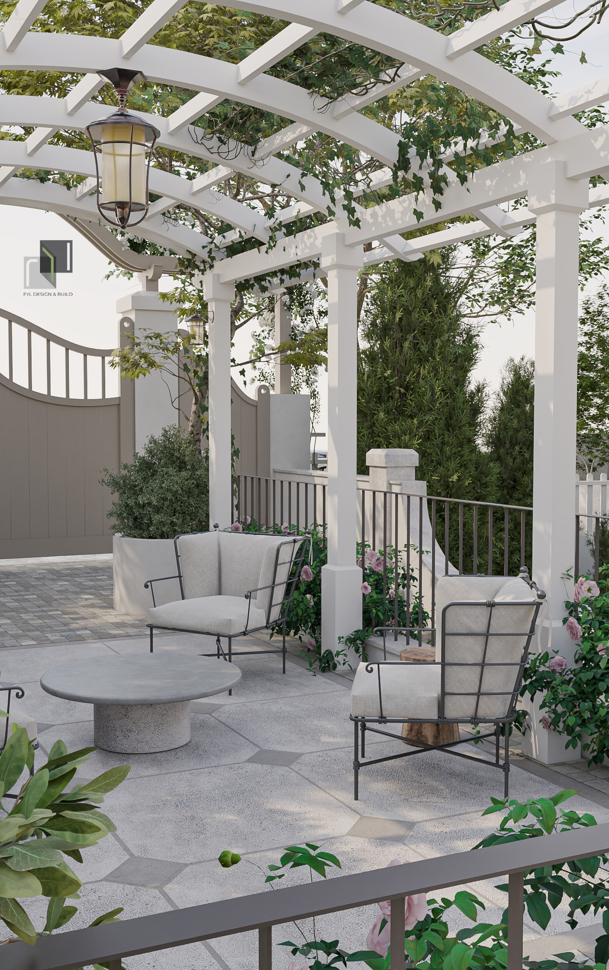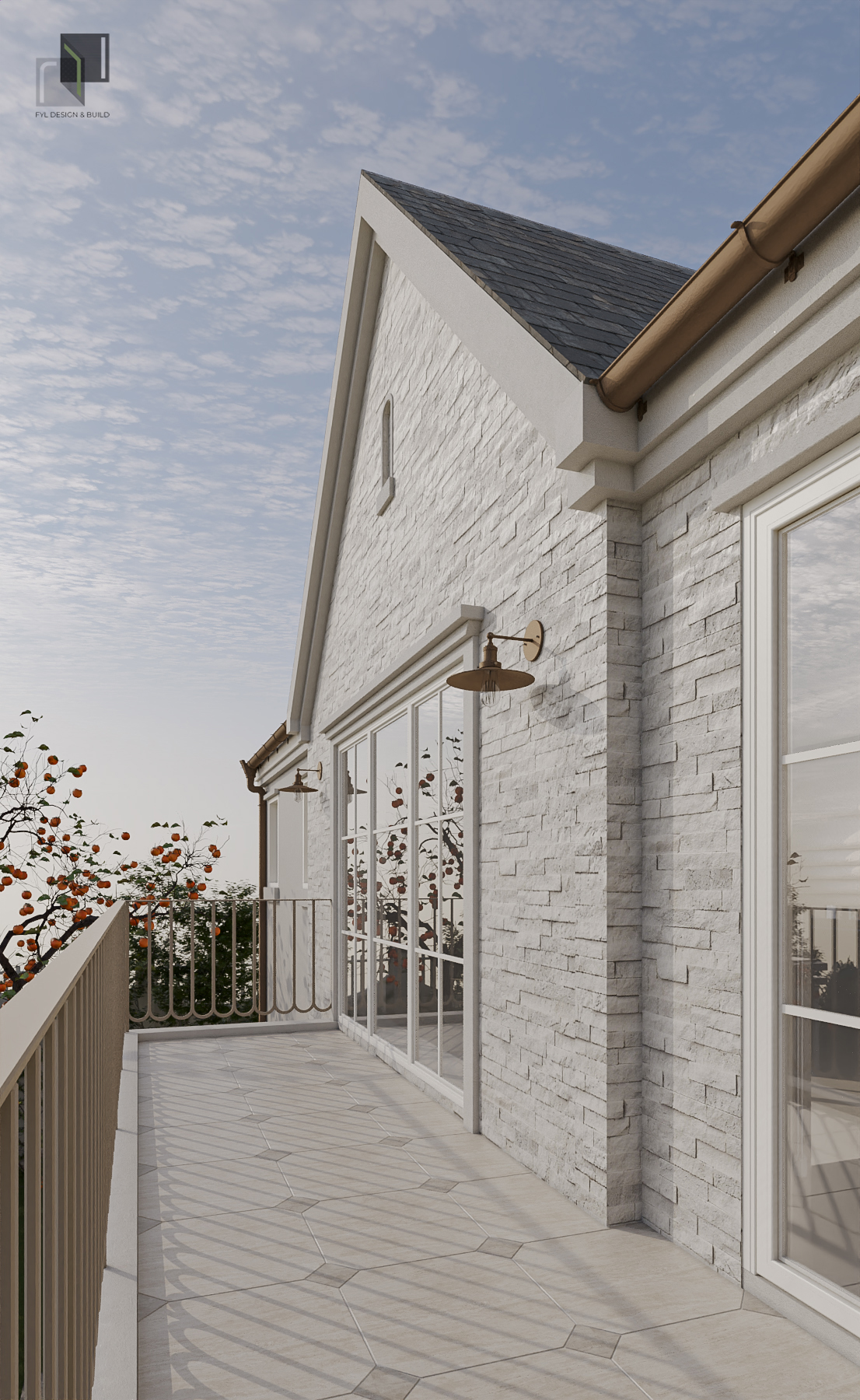 The overall design uses an elegant creamy white palette, accented by grey stone and warm brown wood. Different areas are subtly divided by rough split-stone walls and garden paths.
