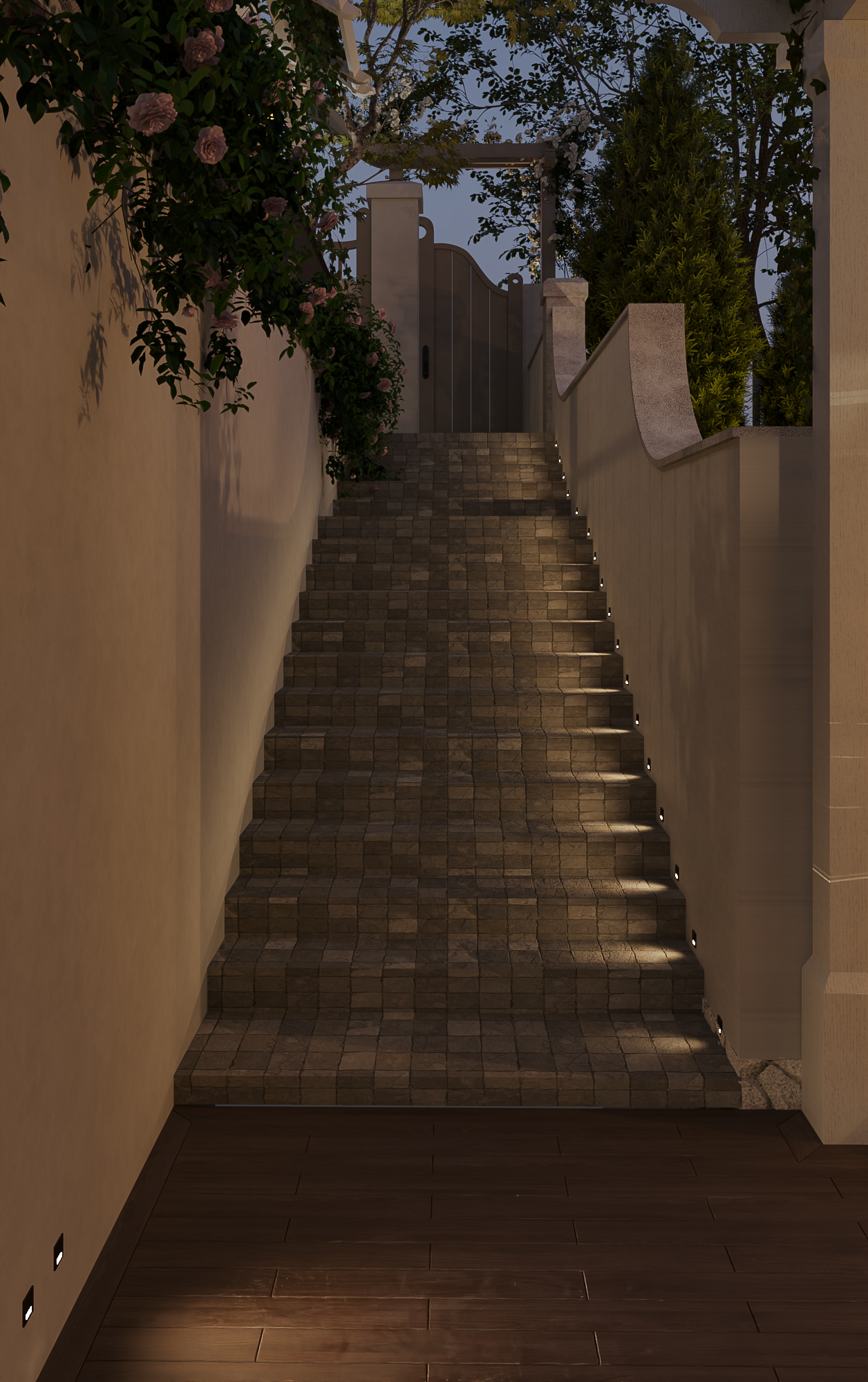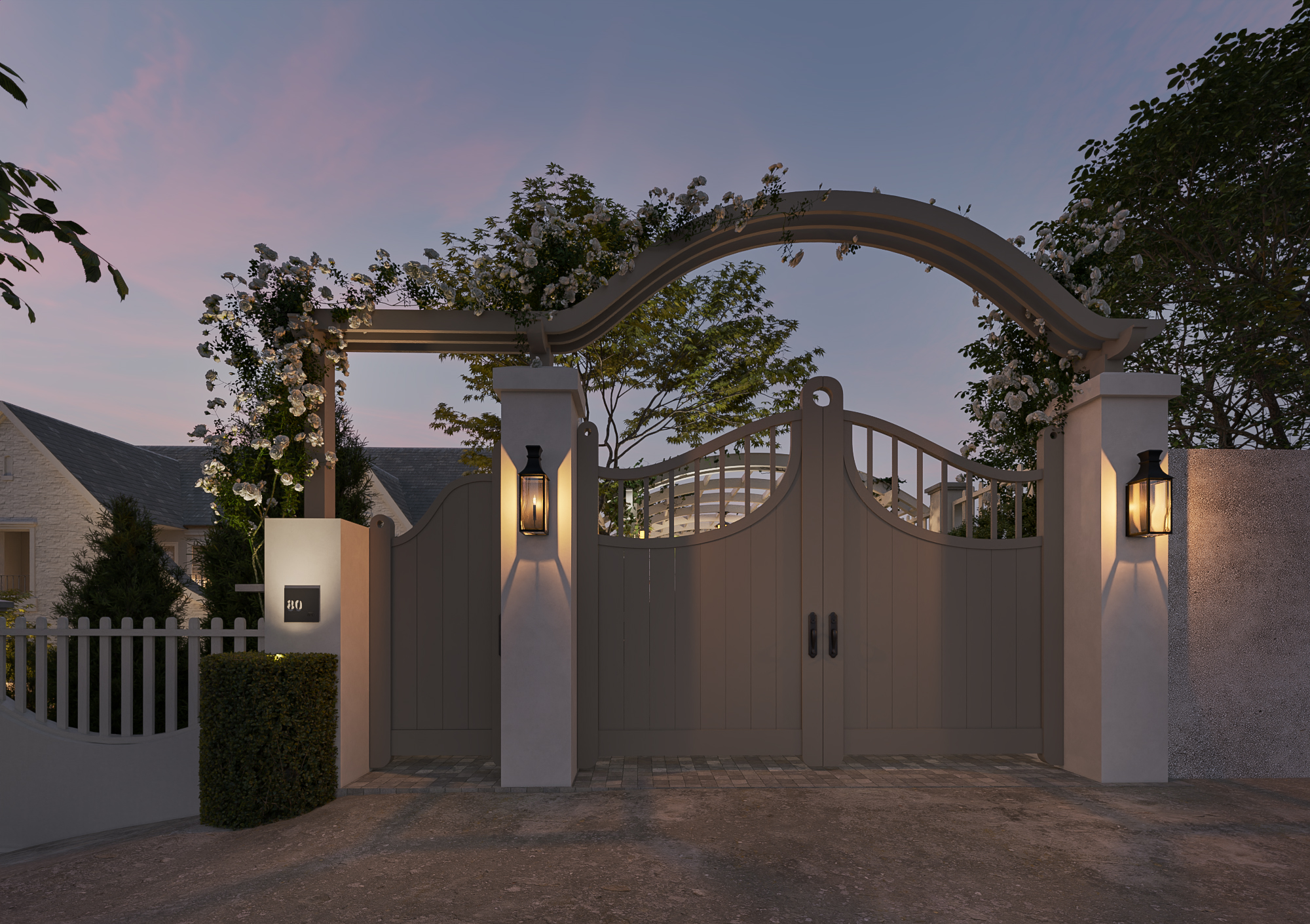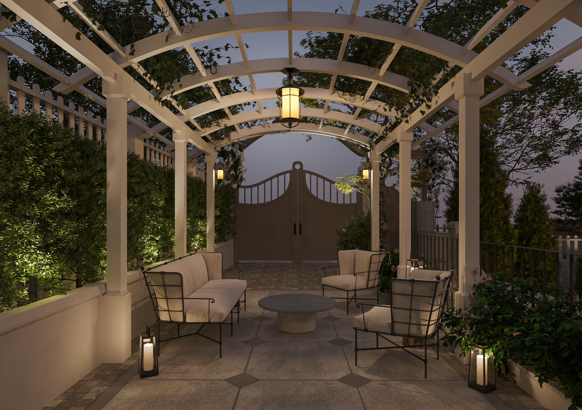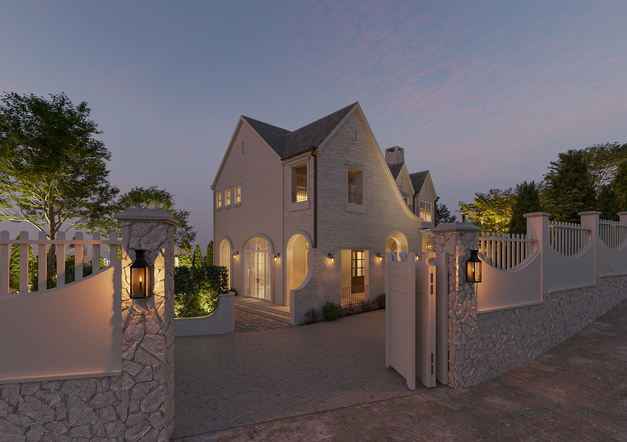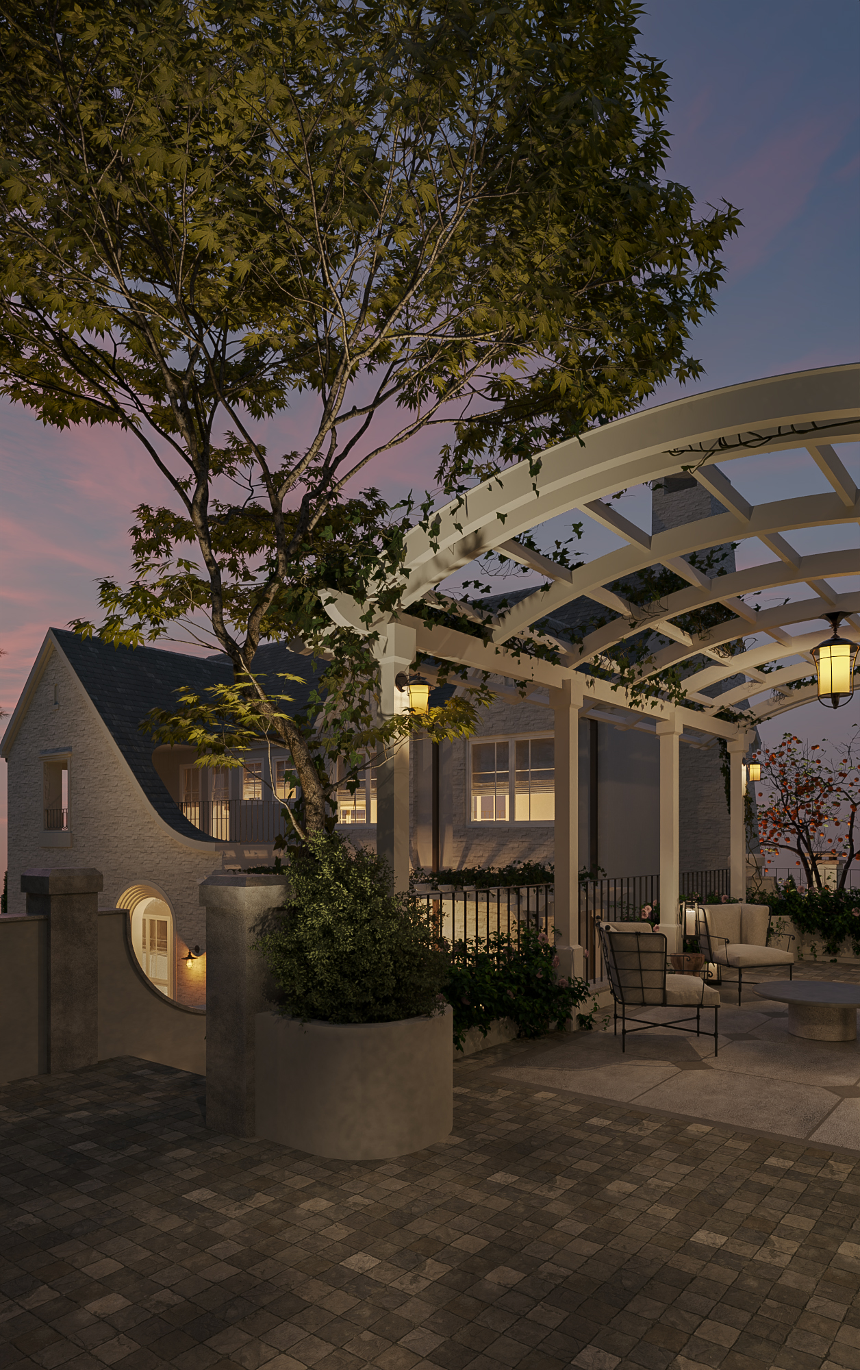 The overall design uses an elegant creamy white palette, accented by grey stone and warm brown wood. Different areas are subtly divided by rough split-stone walls and garden paths.