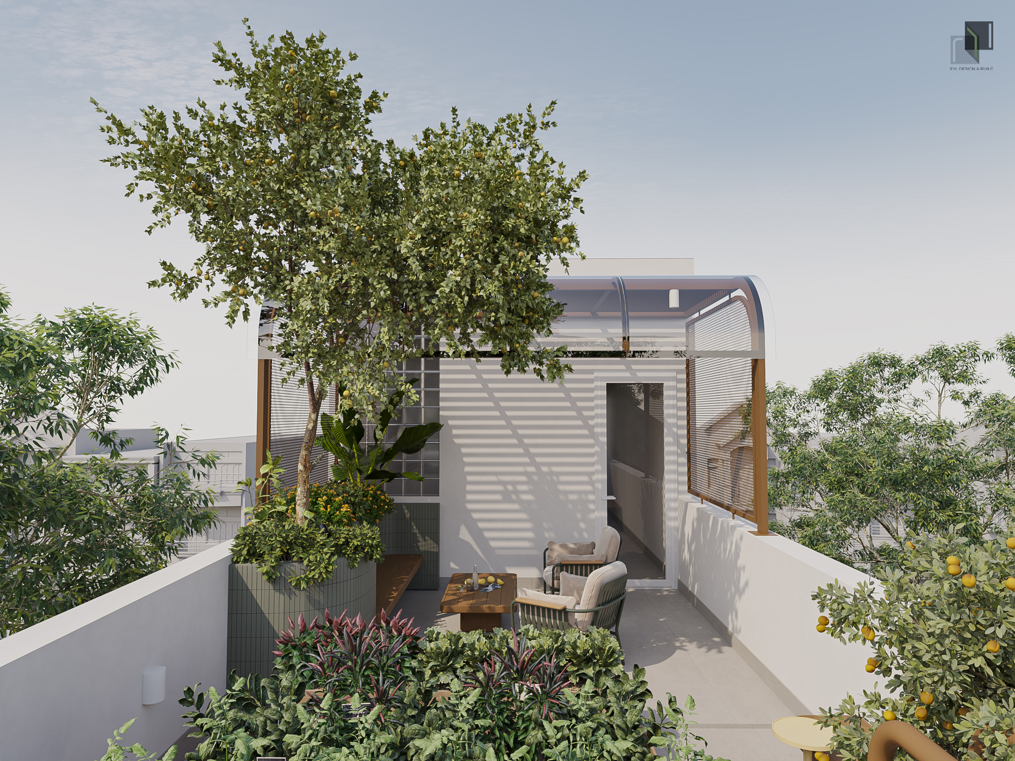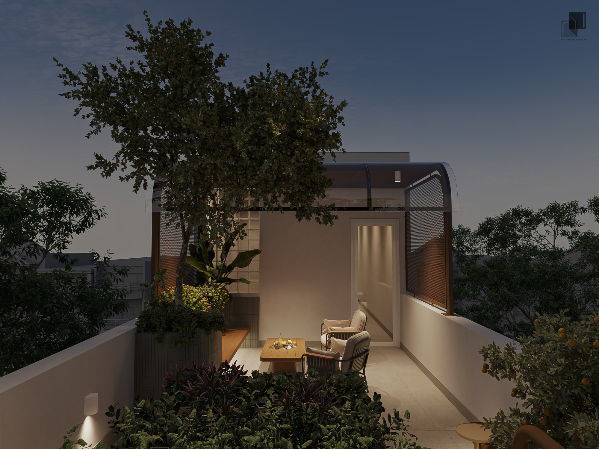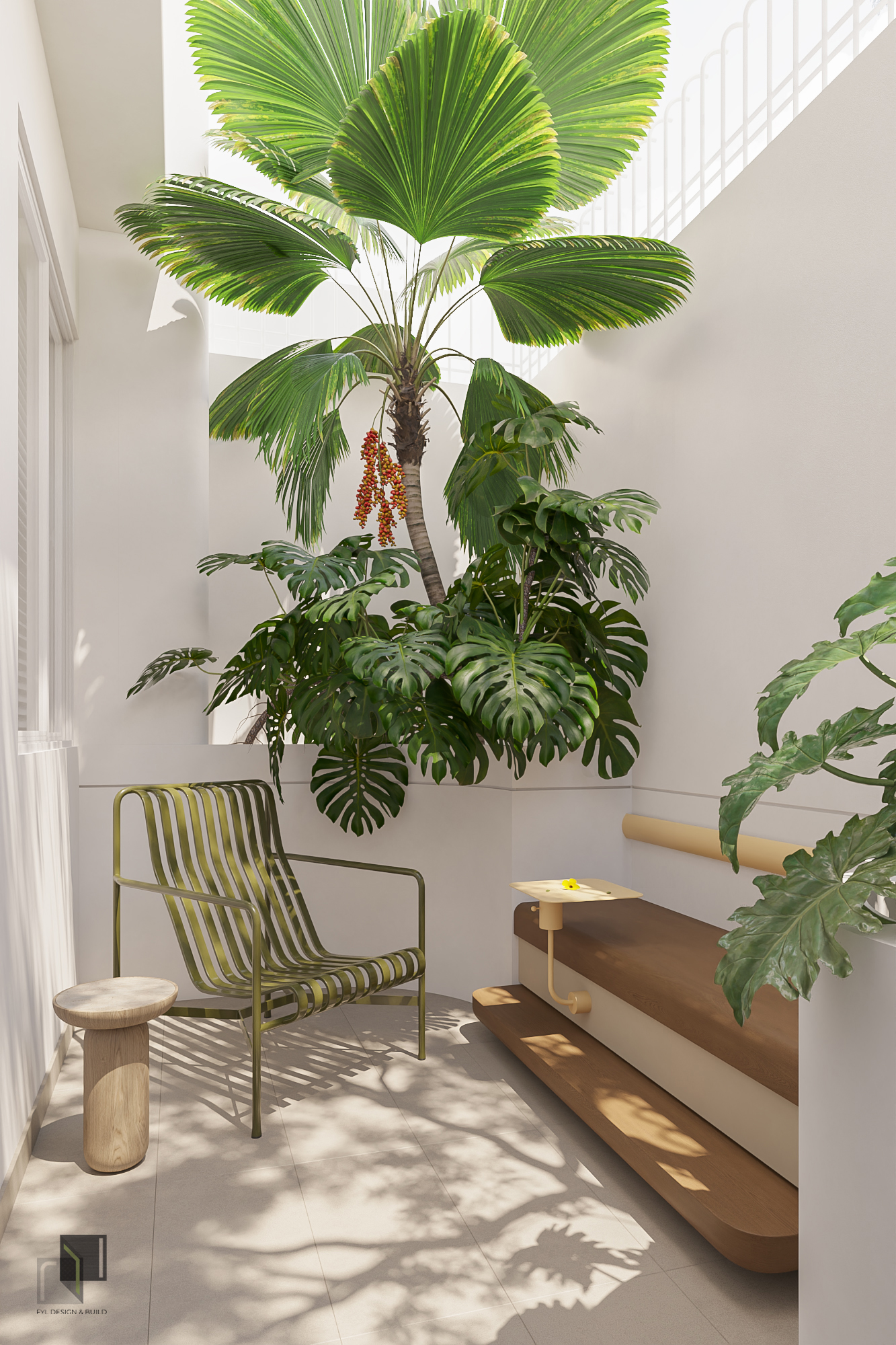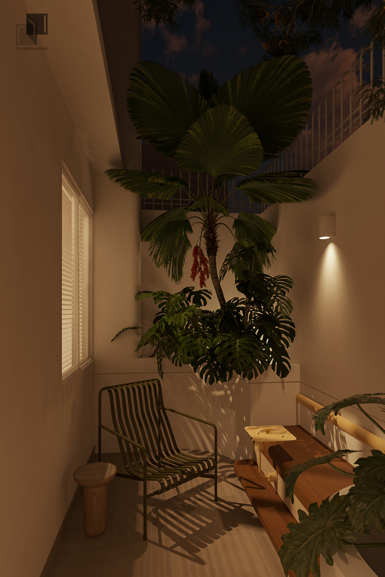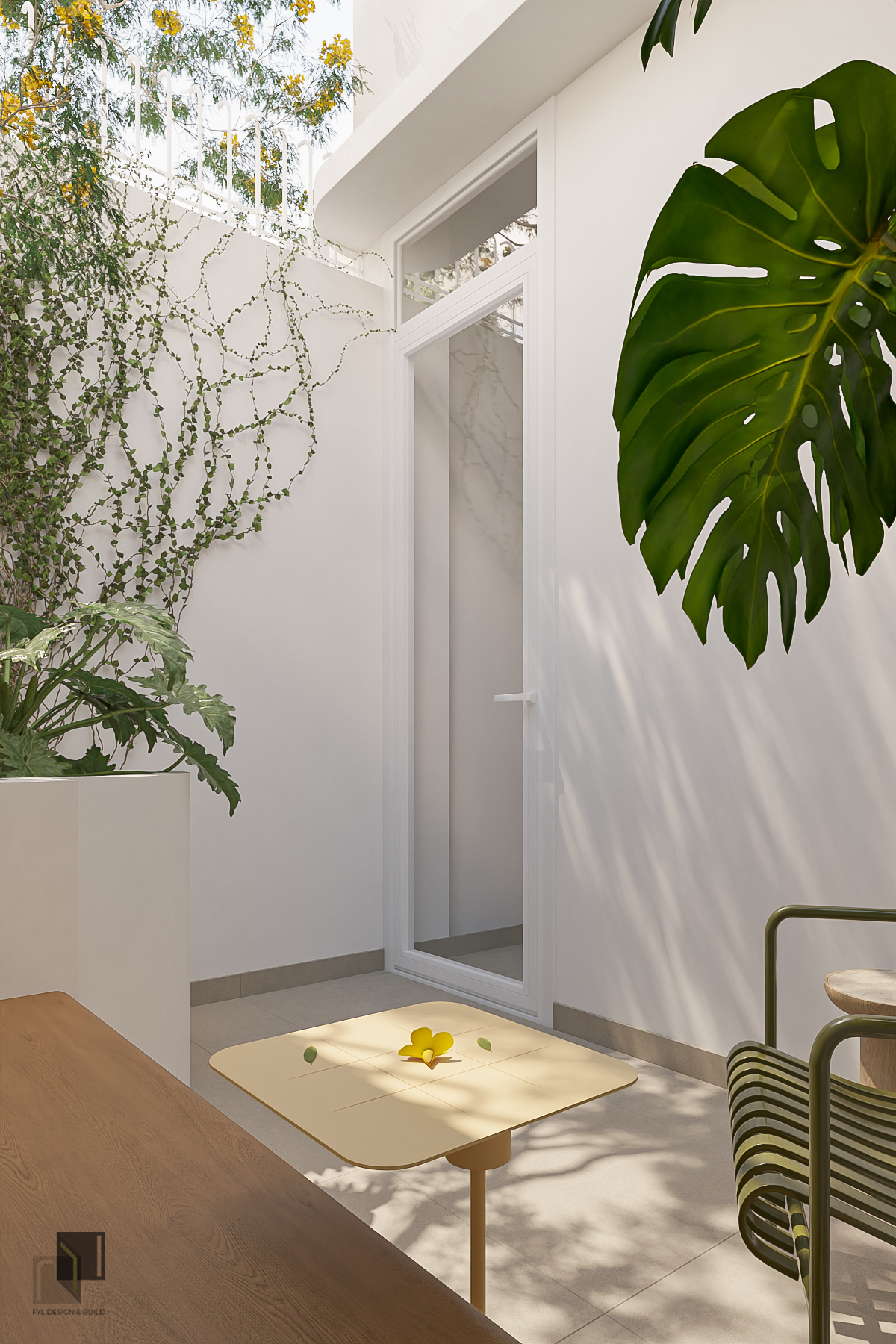 Trên diện tích đất không quá lý tưởng, từng giải pháp bố trí đến đường nét, chất liệu và ánh sáng đều được FYL tính toán kỹ lưỡng. Mục tiêu không chỉ là sự tiện nghi cho sinh hoạt hằng ngày, mà còn là một công cụ kết nối giao tiếp, giúp gắn kết các thành viên trong gia đình, đồng thời vẫn giữ được những khoảng “thở” cho riêng mỗi cá nhân. Các khoảng xanh được đan cài nhịp nhàng: góc vườn rau mẹ chăm chút mỗi ngày, sân nhỏ riêng tư cho “anh chồng” thư giãn, sân thượng cho niềm vui sum họp cả gia đình hay khoảng hiên nhỏ để mỗi người có thể lắng lại giữa kiến trúc và thiên nhiên. Sự dung hòa giữa công năng và thẩm mỹ, giữa riêng tư và kết nối là tinh thần mà FYL đặc biệt tâm đắc.