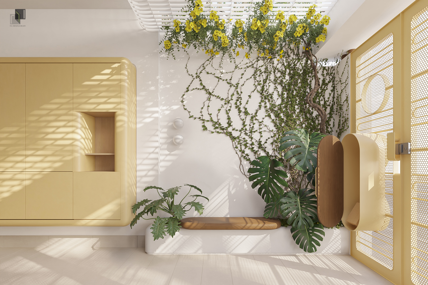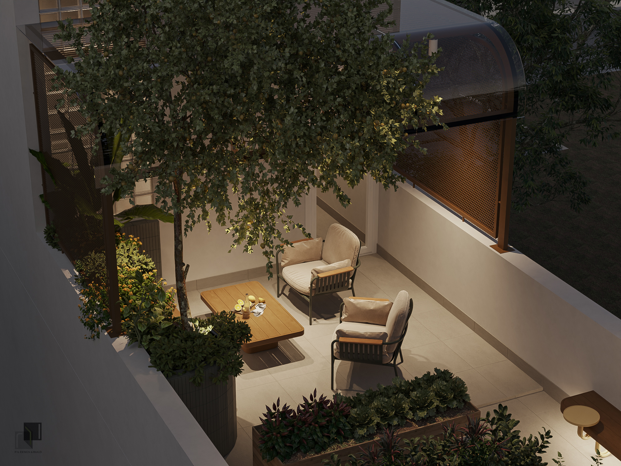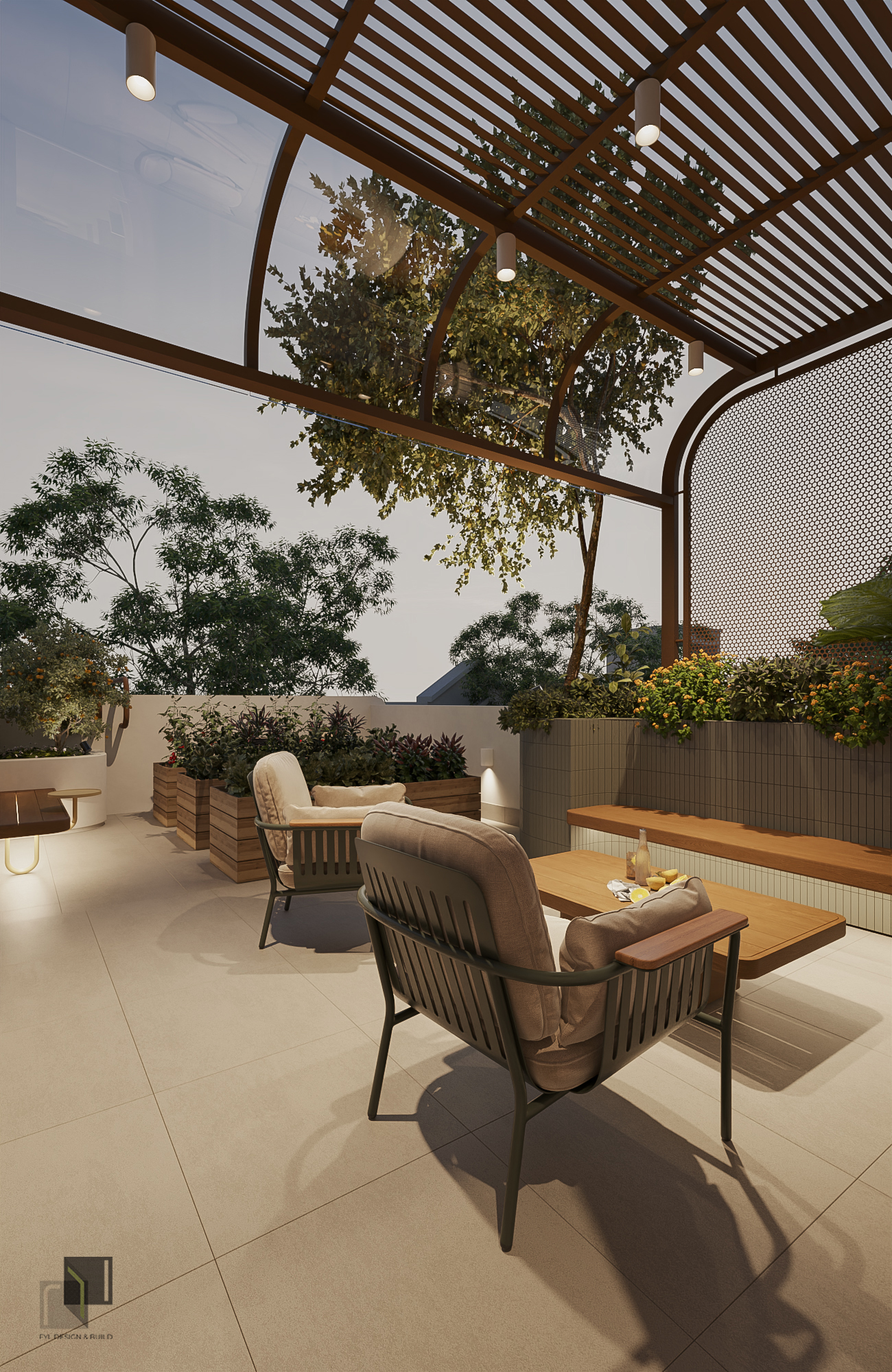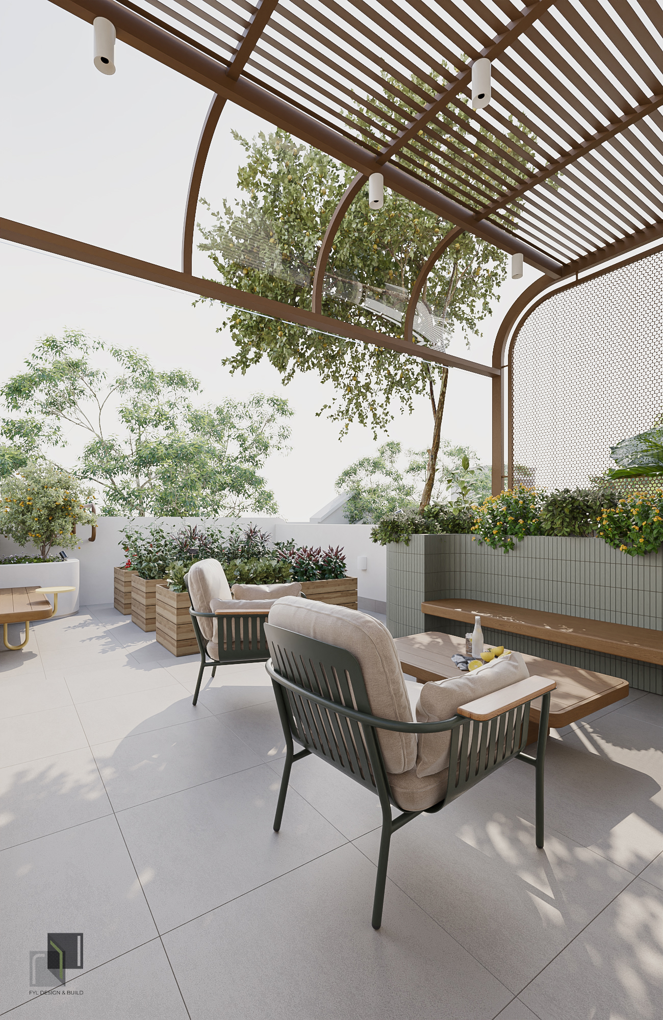 Trên diện tích đất không quá lý tưởng, từng giải pháp bố trí đến đường nét, chất liệu và ánh sáng đều được FYL tính toán kỹ lưỡng. Mục tiêu không chỉ là sự tiện nghi cho sinh hoạt hằng ngày, mà còn là một công cụ kết nối giao tiếp, giúp gắn kết các thành viên trong gia đình, đồng thời vẫn giữ được những khoảng “thở” cho riêng mỗi cá nhân. Các khoảng xanh được đan cài nhịp nhàng: góc vườn rau mẹ chăm chút mỗi ngày, sân nhỏ riêng tư cho “anh chồng” thư giãn, sân thượng cho niềm vui sum họp cả gia đình hay khoảng hiên nhỏ để mỗi người có thể lắng lại giữa kiến trúc và thiên nhiên. Sự dung hòa giữa công năng và thẩm mỹ, giữa riêng tư và kết nối là tinh thần mà FYL đặc biệt tâm đắc.