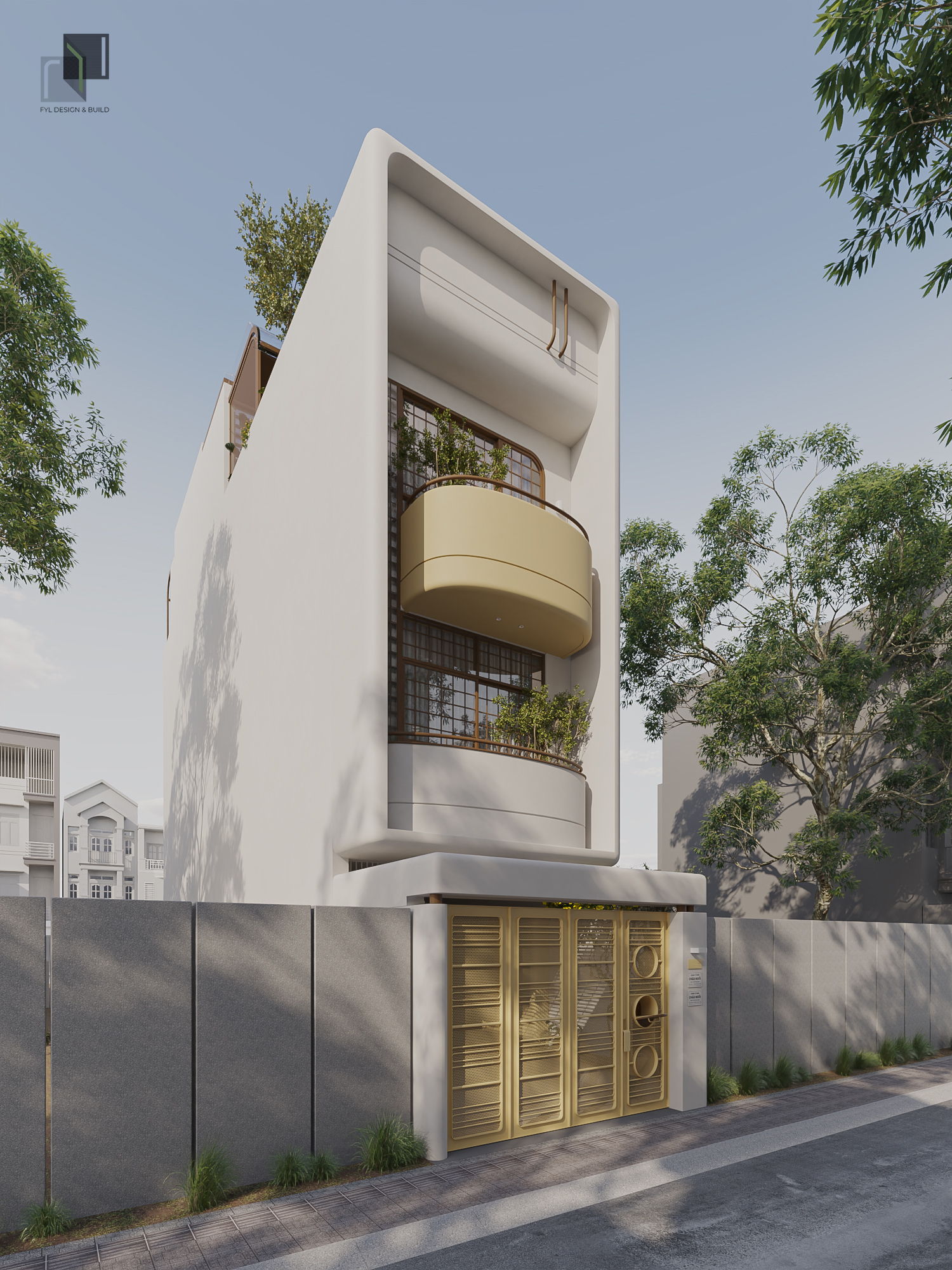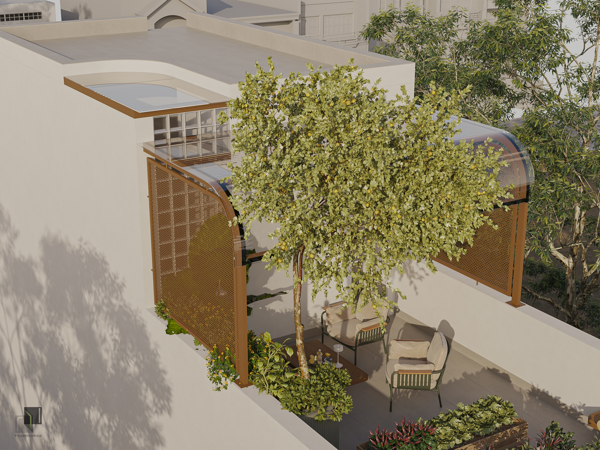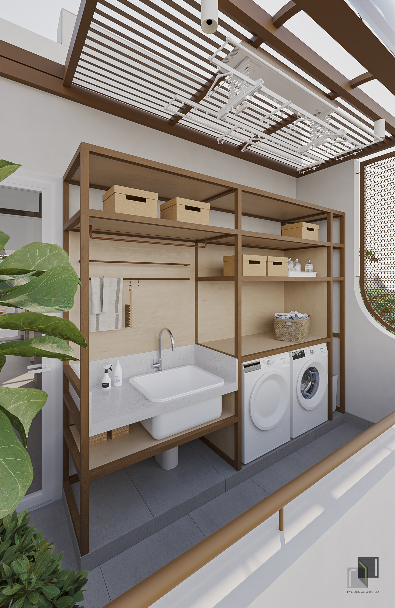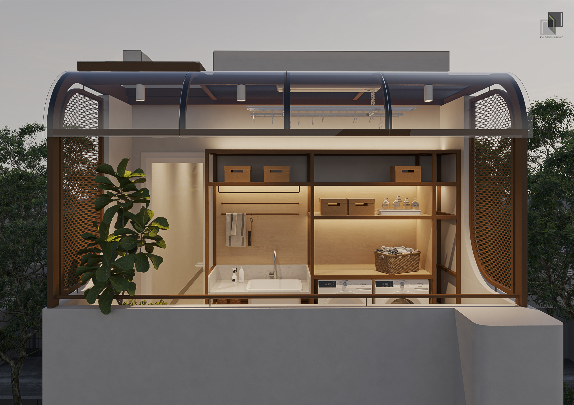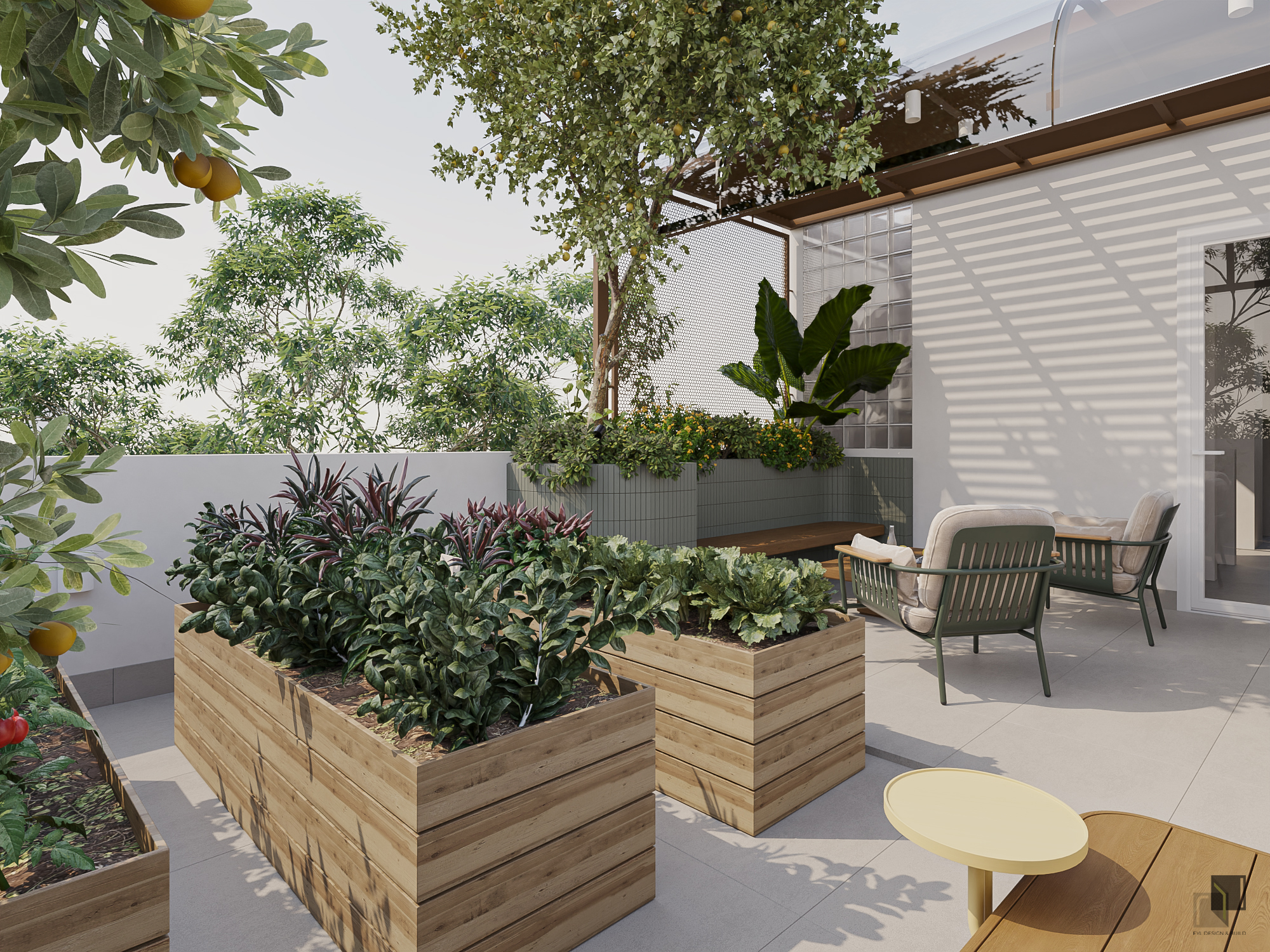 Trên diện tích đất không quá lý tưởng, từng giải pháp bố trí đến đường nét, chất liệu và ánh sáng đều được FYL tính toán kỹ lưỡng. Mục tiêu không chỉ là sự tiện nghi cho sinh hoạt hằng ngày, mà còn là một công cụ kết nối giao tiếp, giúp gắn kết các thành viên trong gia đình, đồng thời vẫn giữ được những khoảng “thở” cho riêng mỗi cá nhân. Các khoảng xanh được đan cài nhịp nhàng: góc vườn rau mẹ chăm chút mỗi ngày, sân nhỏ riêng tư cho “anh chồng” thư giãn, sân thượng cho niềm vui sum họp cả gia đình hay khoảng hiên nhỏ để mỗi người có thể lắng lại giữa kiến trúc và thiên nhiên. Sự dung hòa giữa công năng và thẩm mỹ, giữa riêng tư và kết nối là tinh thần mà FYL đặc biệt tâm đắc.