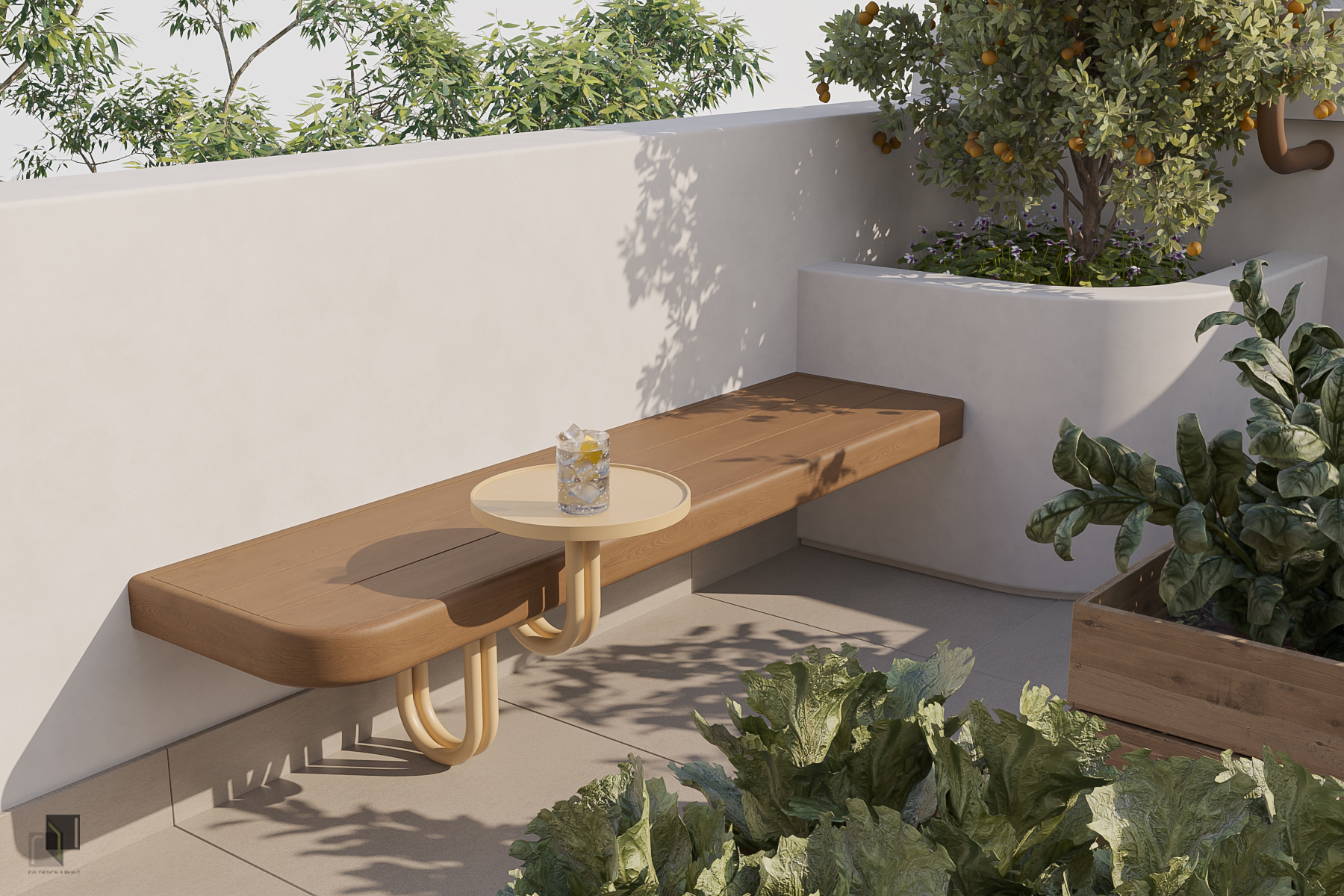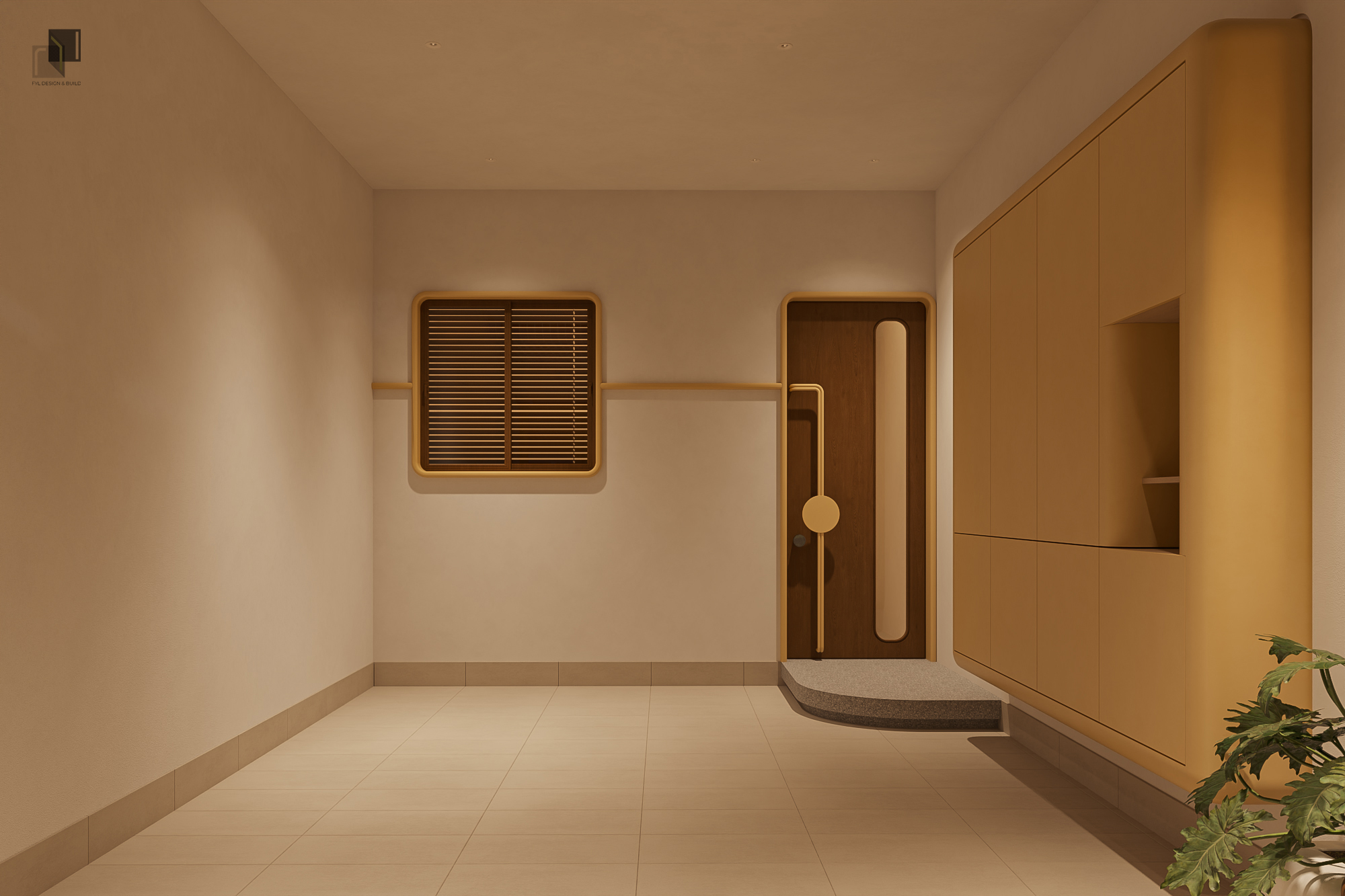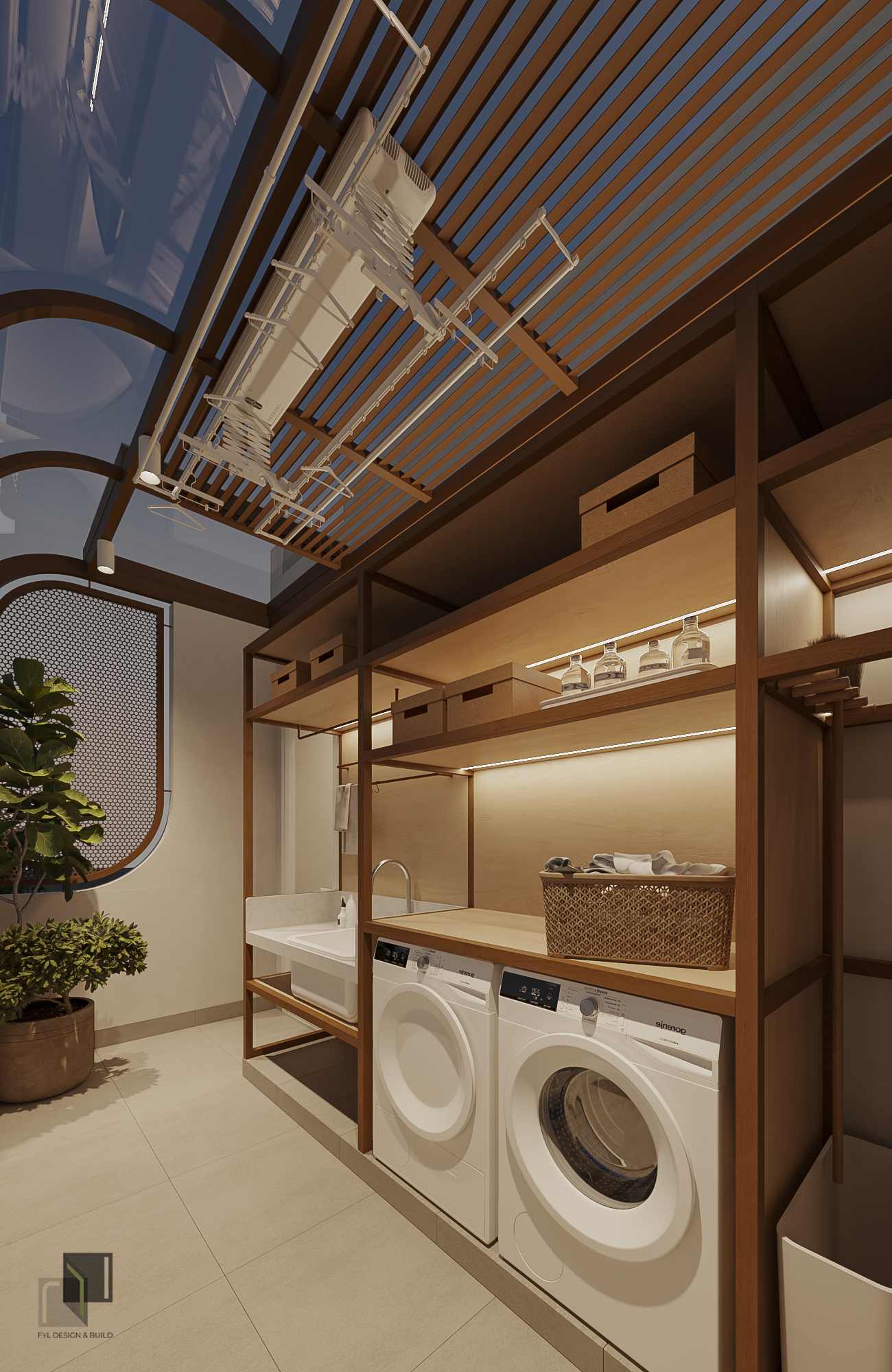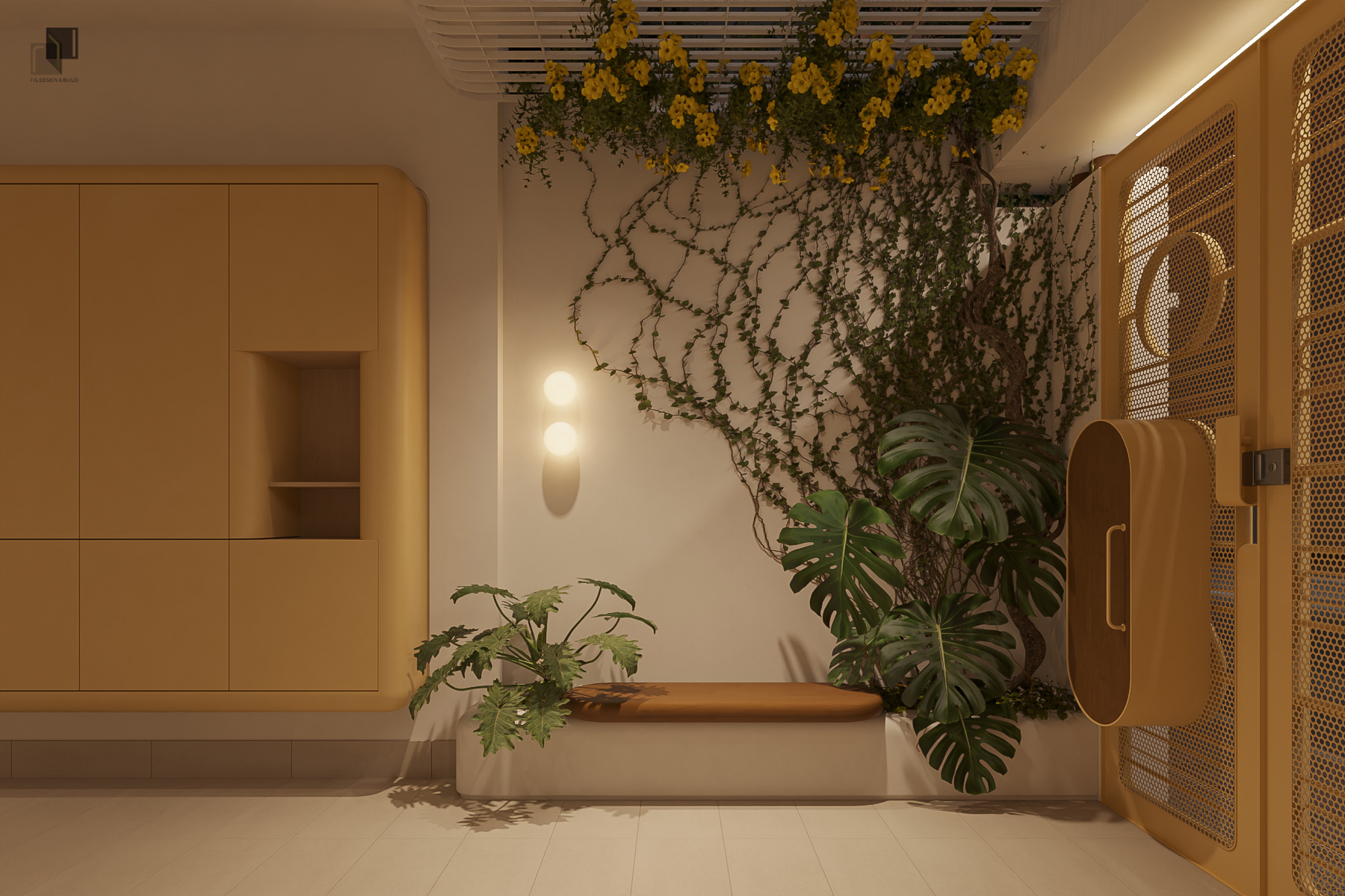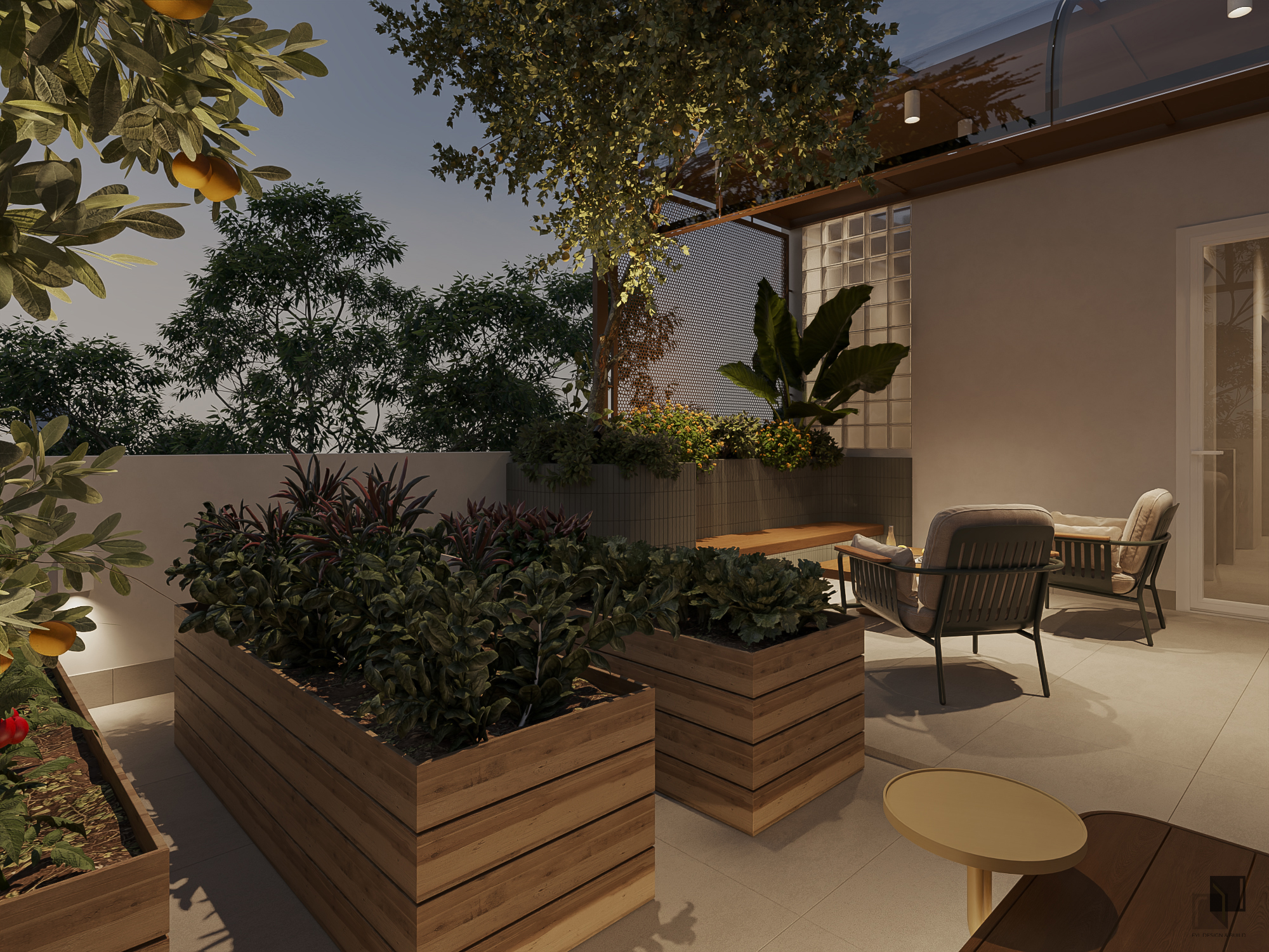 Trên diện tích đất không quá lý tưởng, từng giải pháp bố trí đến đường nét, chất liệu và ánh sáng đều được FYL tính toán kỹ lưỡng. Mục tiêu không chỉ là sự tiện nghi cho sinh hoạt hằng ngày, mà còn là một công cụ kết nối giao tiếp, giúp gắn kết các thành viên trong gia đình, đồng thời vẫn giữ được những khoảng “thở” cho riêng mỗi cá nhân. Các khoảng xanh được đan cài nhịp nhàng: góc vườn rau mẹ chăm chút mỗi ngày, sân nhỏ riêng tư cho “anh chồng” thư giãn, sân thượng cho niềm vui sum họp cả gia đình hay khoảng hiên nhỏ để mỗi người có thể lắng lại giữa kiến trúc và thiên nhiên. Sự dung hòa giữa công năng và thẩm mỹ, giữa riêng tư và kết nối là tinh thần mà FYL đặc biệt tâm đắc.