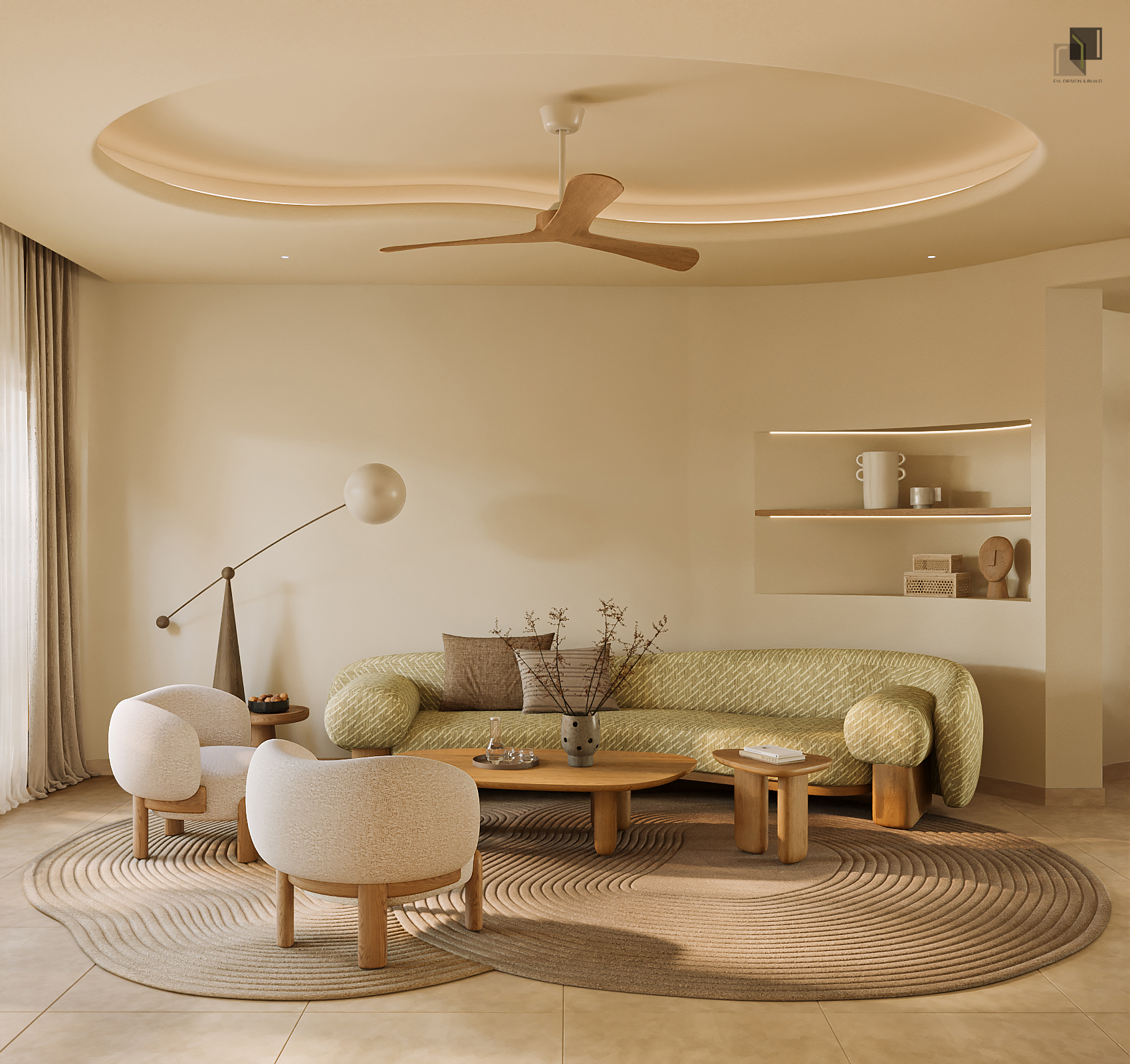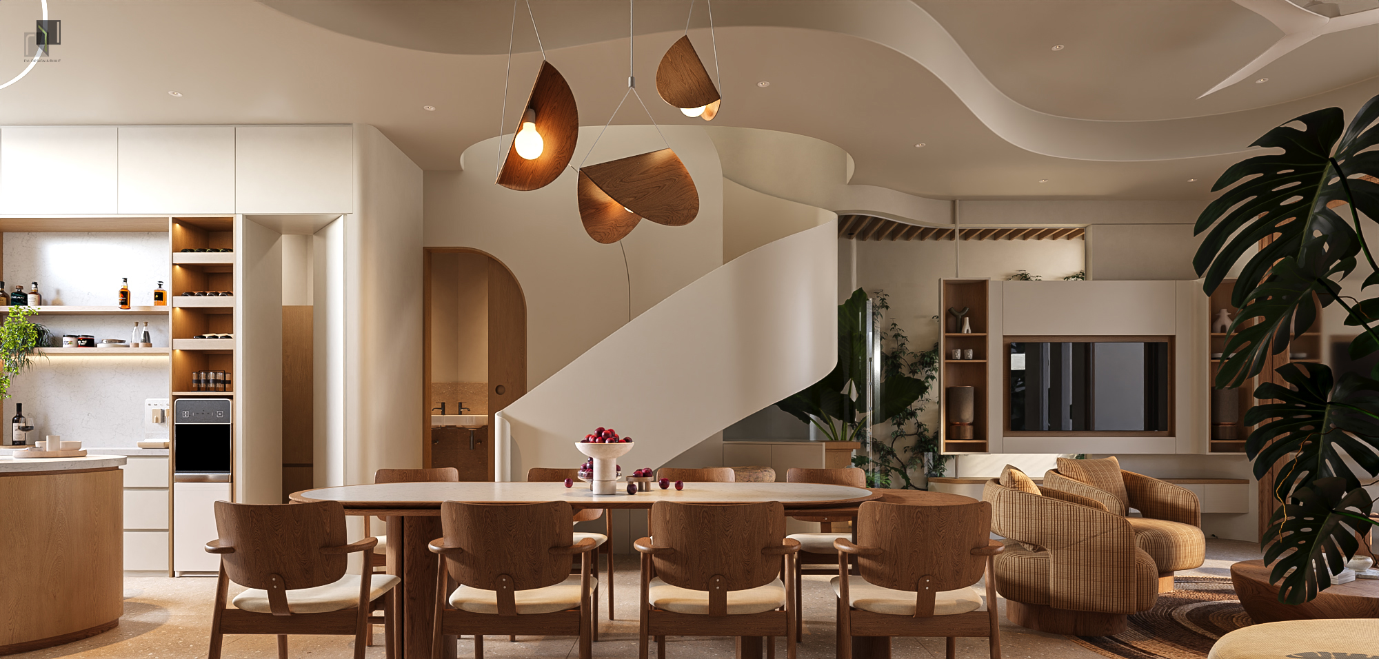 Nguồn cảm hứng từ sự mềm mại và những đường cong duyên dáng của những dải ruy băng tạo nên những tấm bề mặt uốn lượn và chuyển động nhẹ nhàng liên tục bao quanh khối kiến trúc. Những “sợi duy băng” này chính là mối liên kết vừa vô hình lại vừa hữu hình với niềm đam mê và vô cùng gần gũi trong công việc thường nhật của gia chủ.