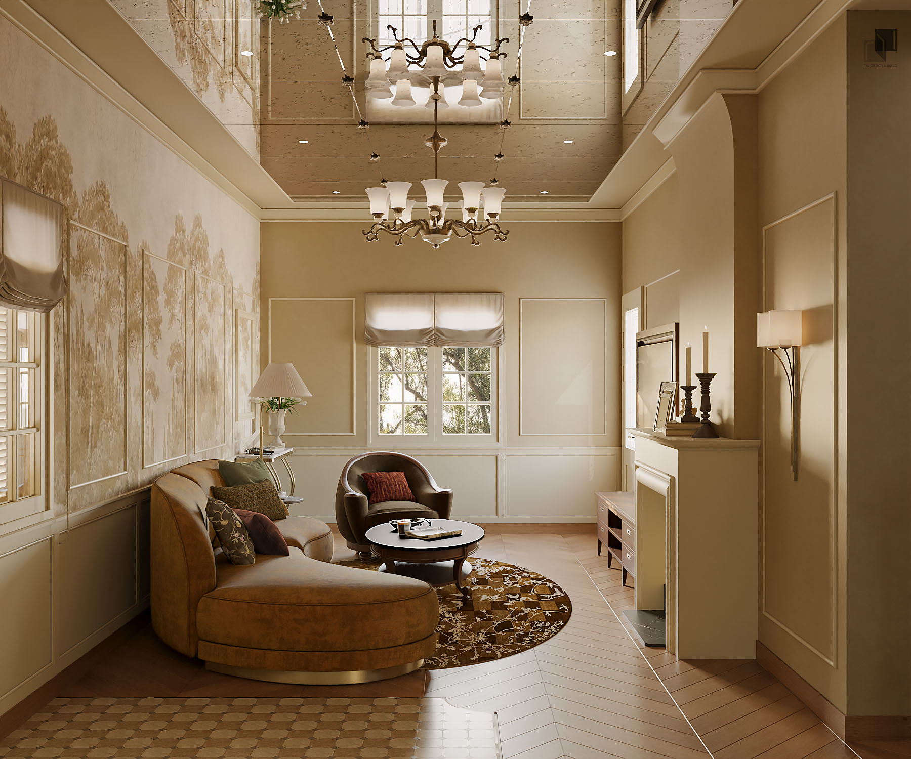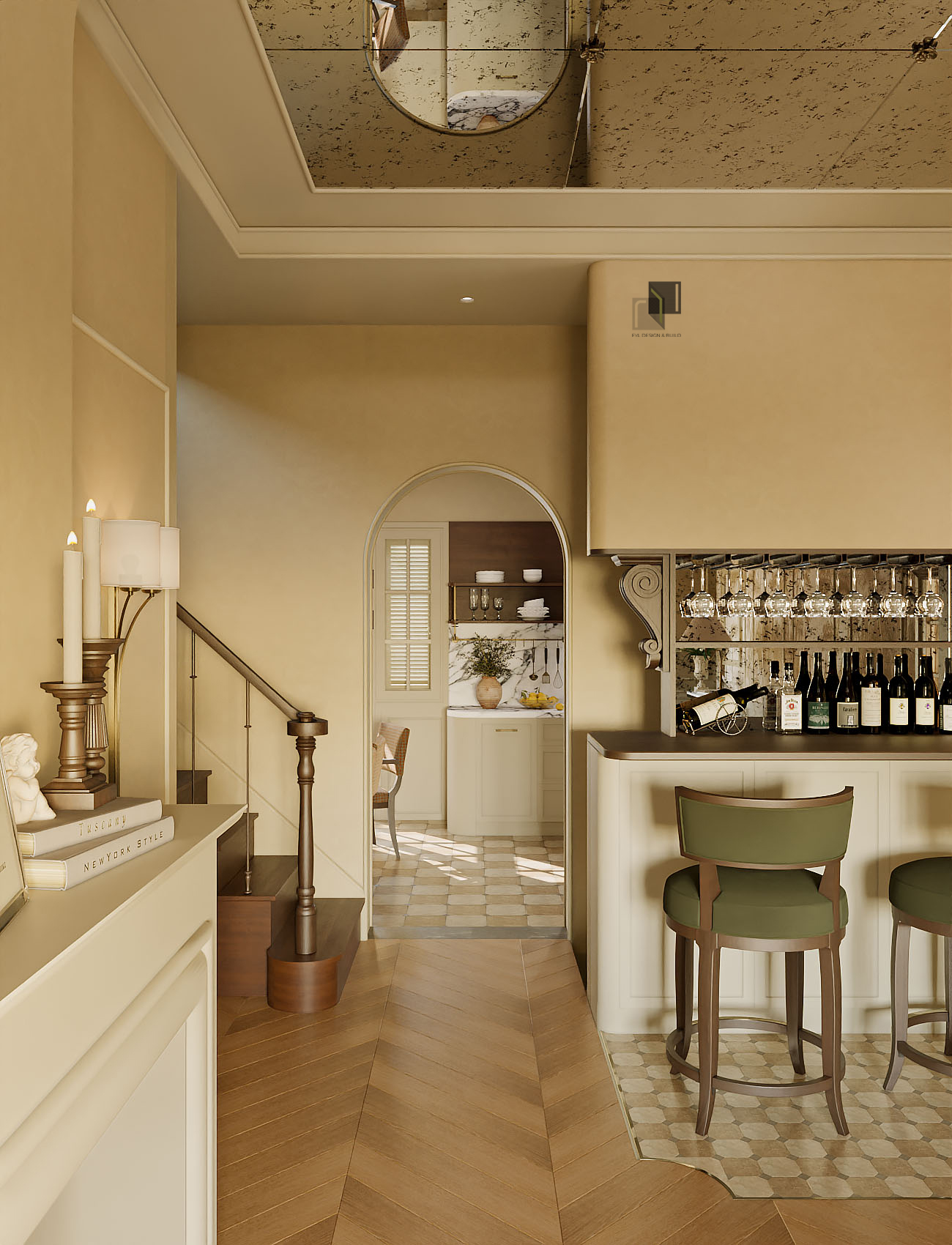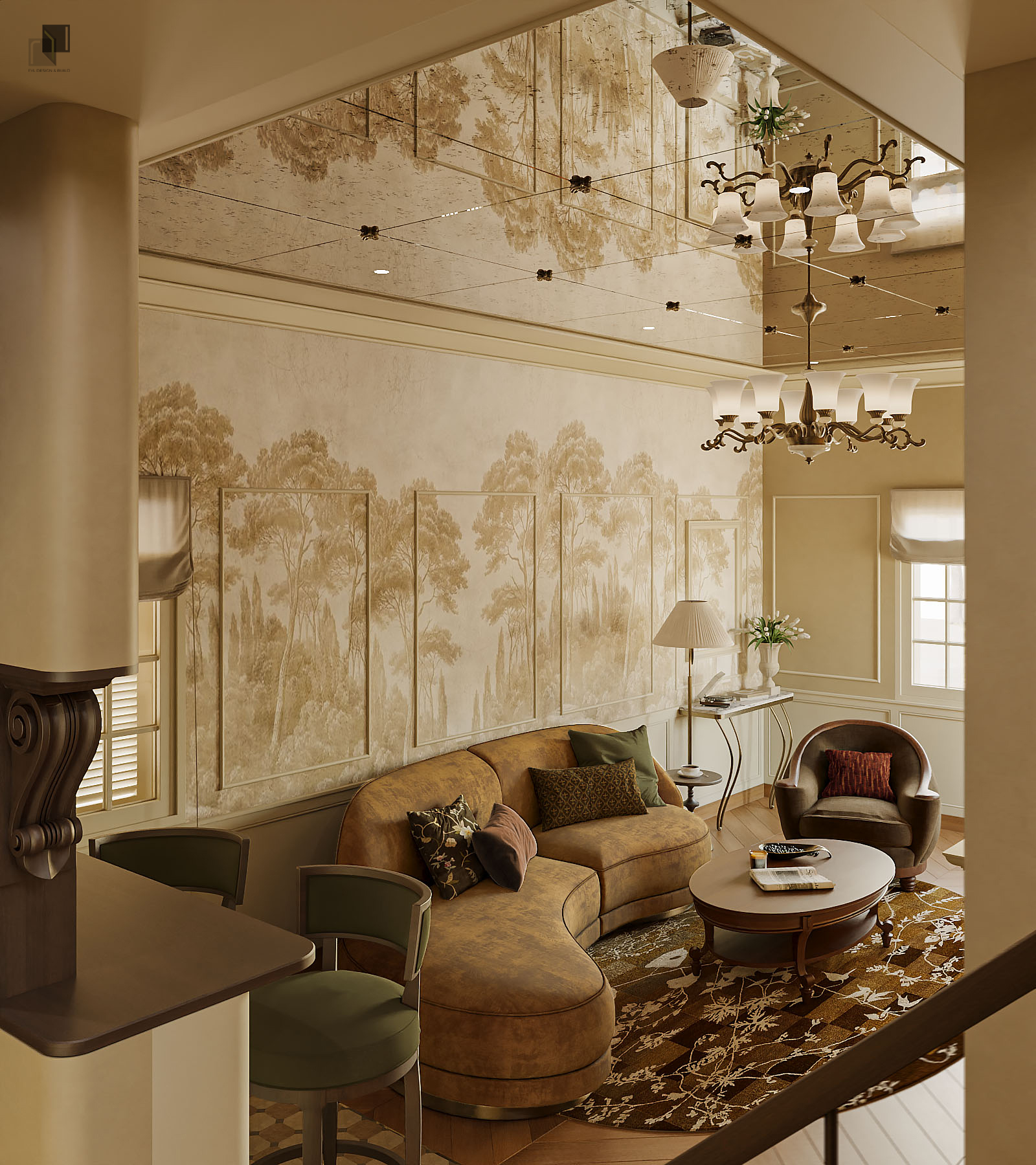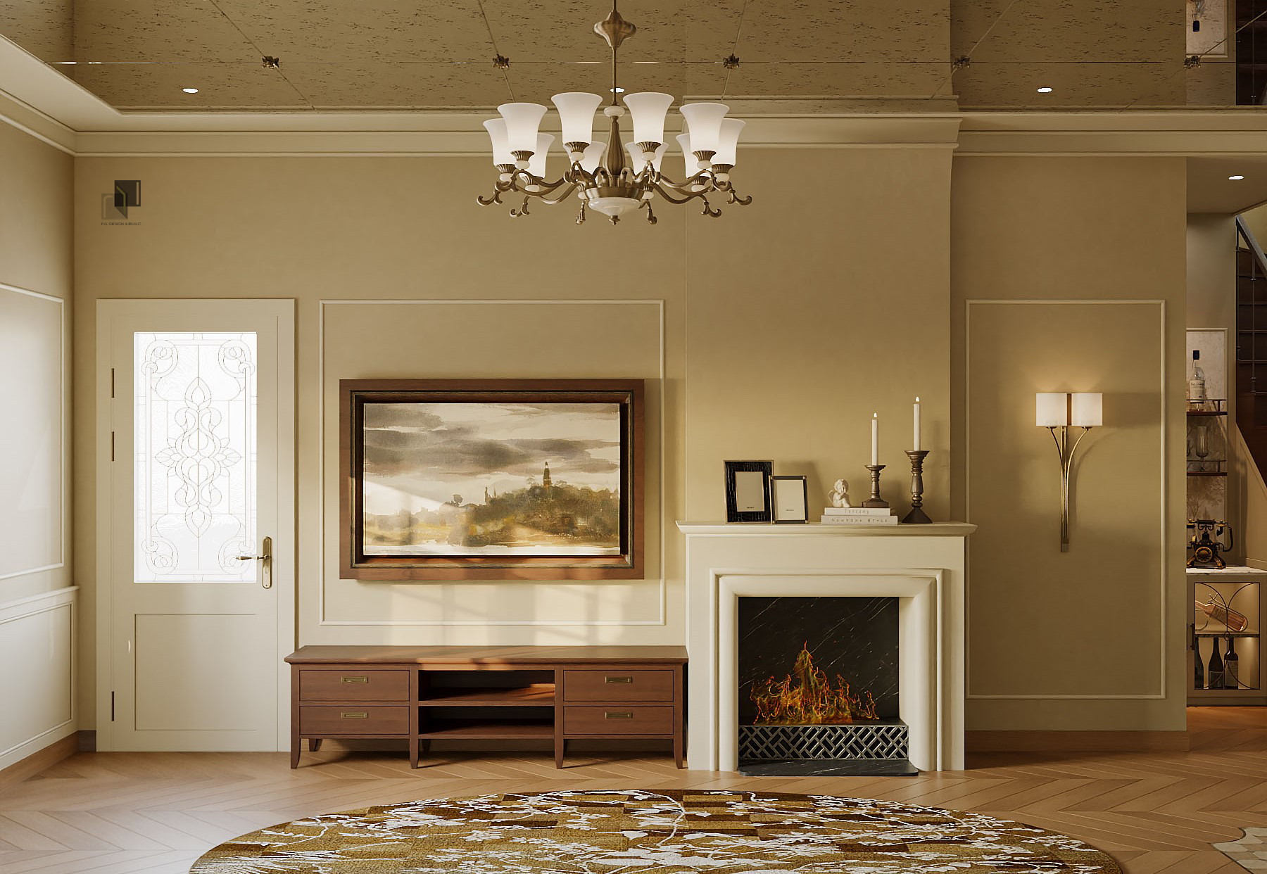 Với diện tích phân chia các phòng trong villa không quá rộng, giải pháp thiết kế tập trung vào việc giải phóng không gian bằng cách giản lược các chi tiết trang trí rườm rà và hạn chế chia cắt không gian. Các chi tiết chỉ cổ điển trong nội thất không được sử dụng dày đặc mà được chắt lọc có chủ ý. Những đường chỉ nhẹ, tinh tế vừa đủ để gợi nhắc phong cách cổ điển mà không làm không gian trở nên nặng nề.