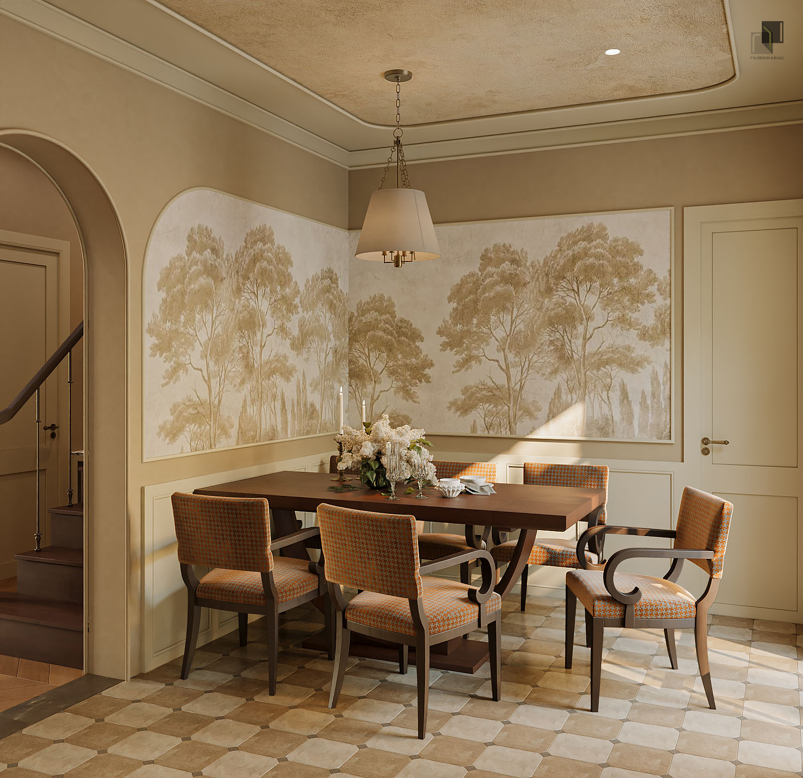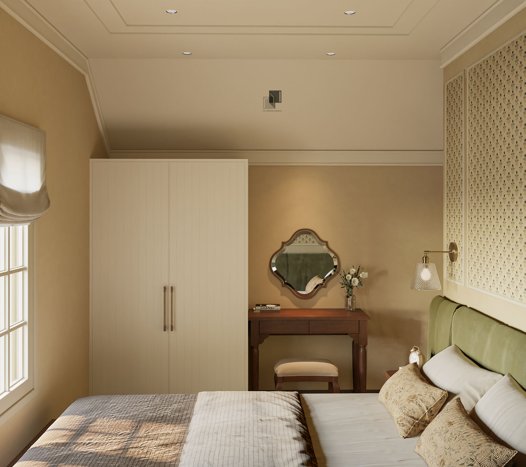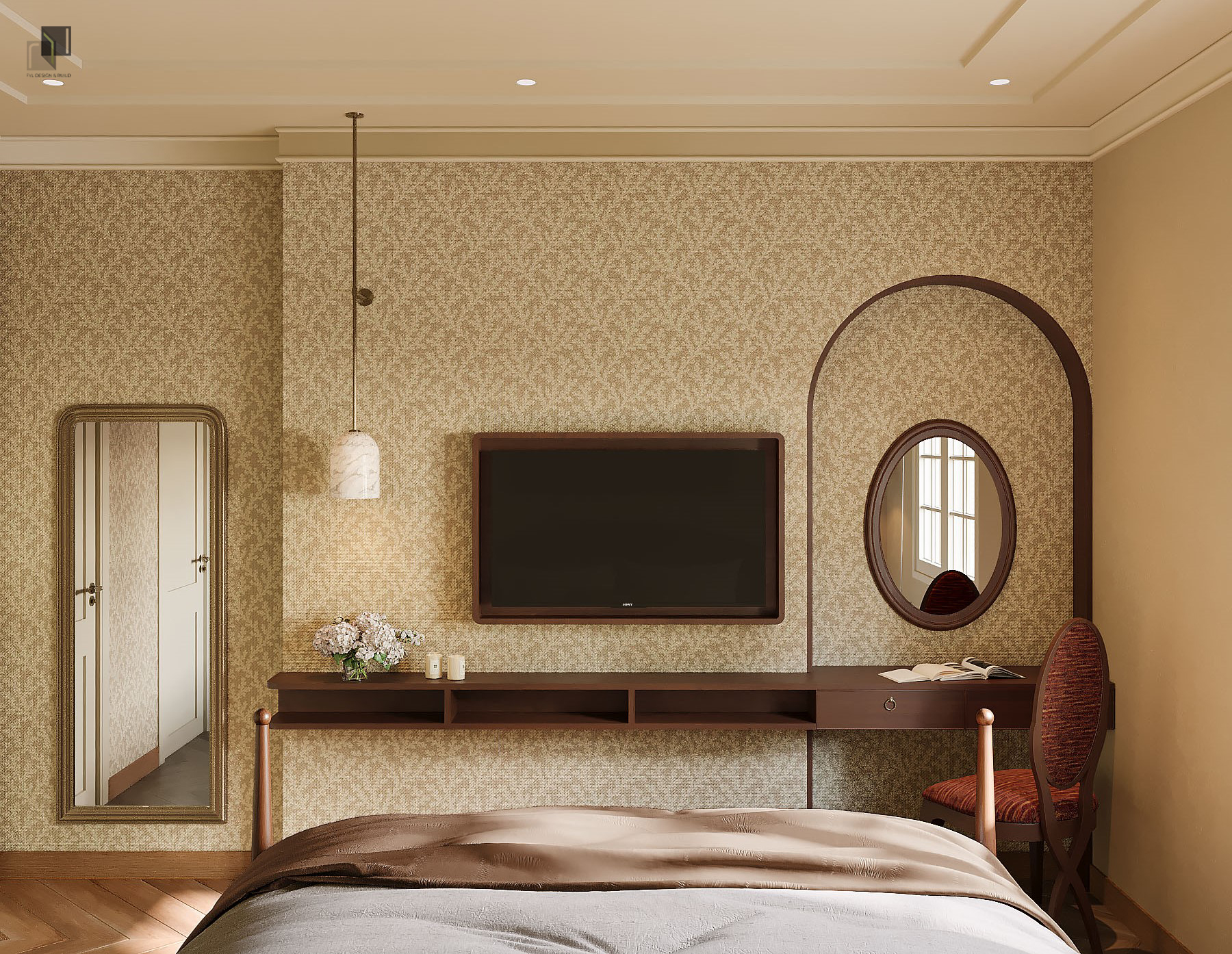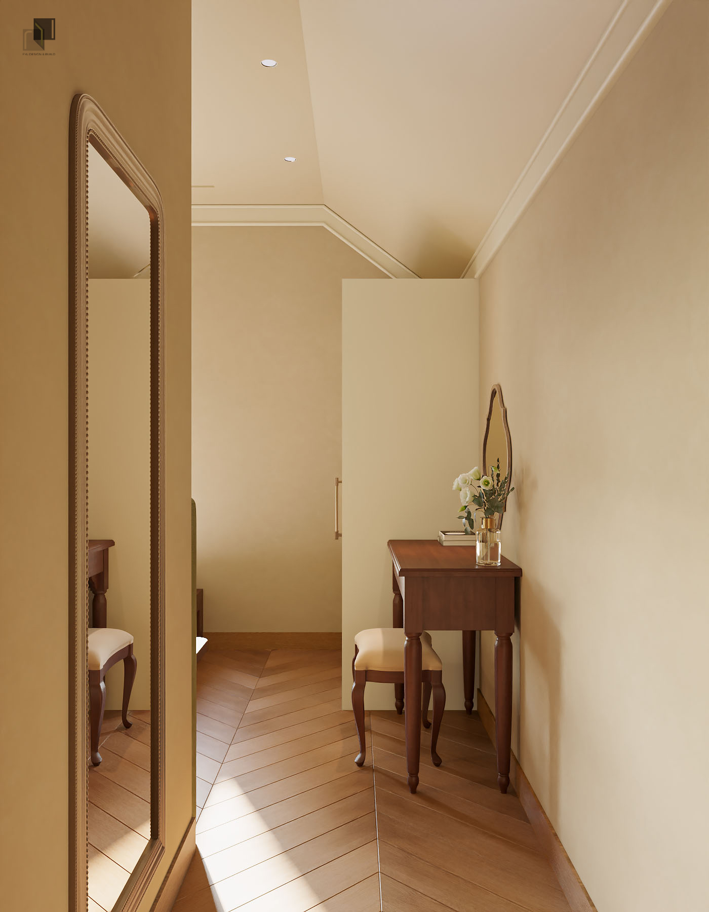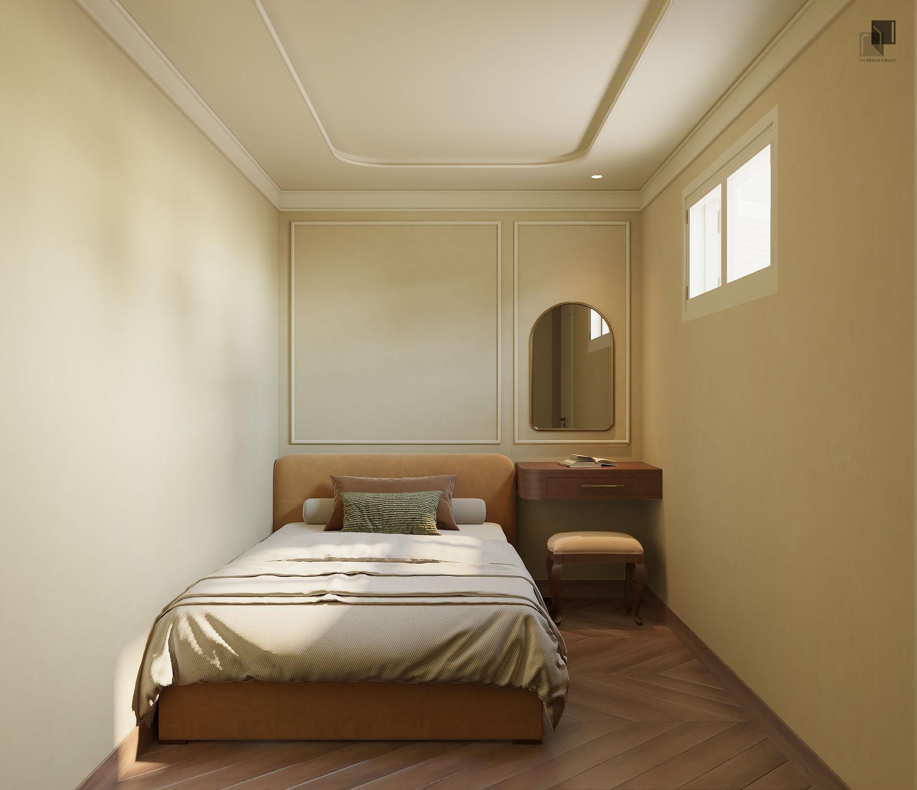 Với diện tích phân chia các phòng trong villa không quá rộng, giải pháp thiết kế tập trung vào việc giải phóng không gian bằng cách giản lược các chi tiết trang trí rườm rà và hạn chế chia cắt không gian. Các chi tiết chỉ cổ điển trong nội thất không được sử dụng dày đặc mà được chắt lọc có chủ ý. Những đường chỉ nhẹ, tinh tế vừa đủ để gợi nhắc phong cách cổ điển mà không làm không gian trở nên nặng nề.