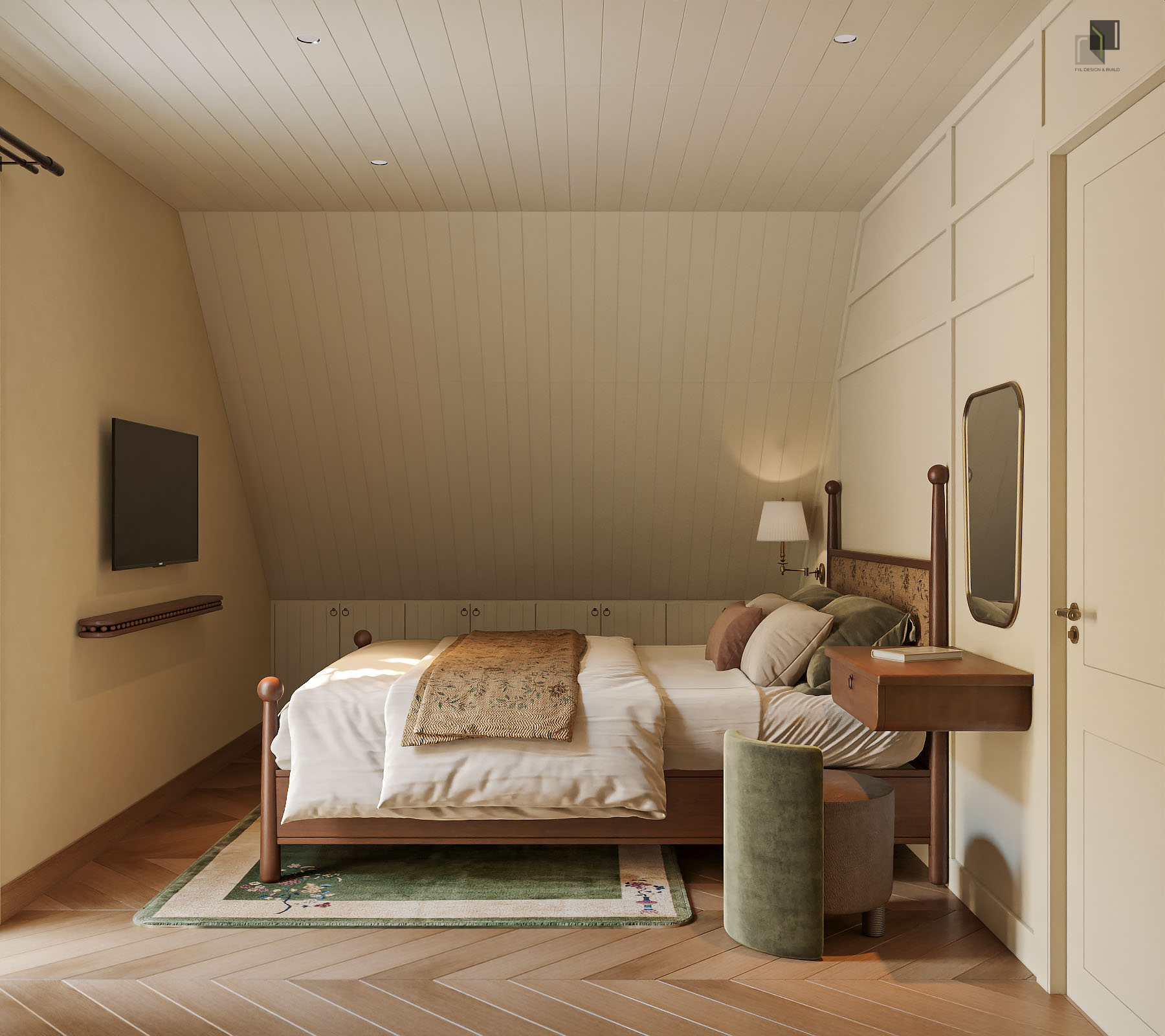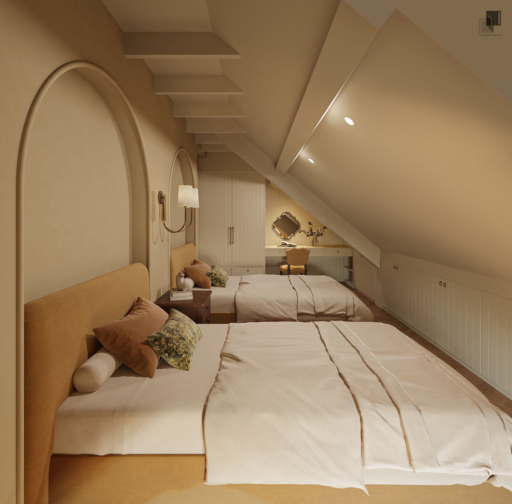 Concept nội thất được team định hướng theo hình tượng vẻ đẹp của Đà Lạt có sự dịu dàng, truyền thống mà vẫn đầy sự bí ẩn giữa làn sương mờ và những rặng thông trùng điệp. Không gian nội thất vì vậy không phô trương mà mang tính gợi mở, nhẹ nhàng, tạo cảm giác mơ hồ và sâu lắng. Ánh sáng được xử lý mềm mại, kết hợp cùng màu sắc trung tính và chất liệu tự nhiên, giúp không gian luôn có cảm giác mờ ảo, trầm lắng nhưng ấm áp.